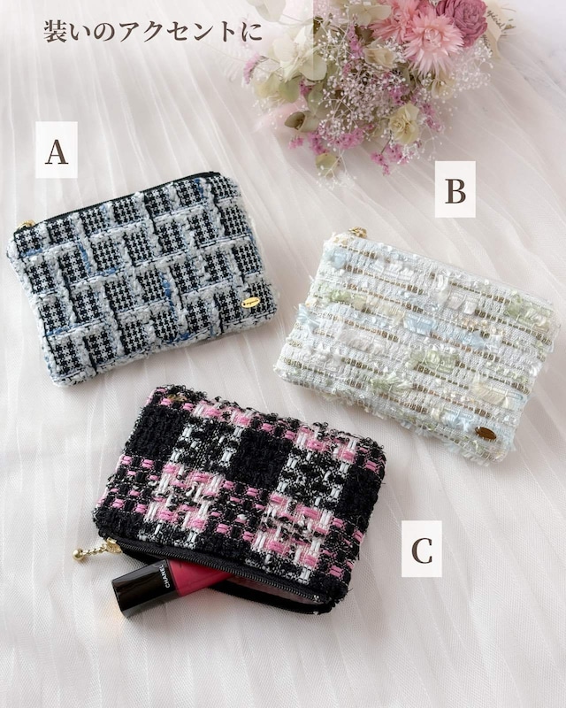 ミニフラットポーチ ニュアンスカラー ラベンダー クリーム アイスブルー パステル 化粧ポーチ Miros ツイード プレゼントに♡