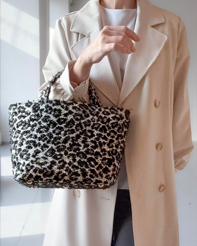 春のシンプルな装いに、 さりげないアクセントを。 モノトーンのレオパードツイードで仕立てた ミニトートバッグ。 落ち着いたブラックとホワイトの配色なので、 レオパード柄でも上品にお持ちいただけます。 ブラックとホワイトのレオパードに、 シャンパンゴールドの糸が繊細にきらめき、 装いを上品に引き立てます。 生地には、ハイブランドにも採用される 日本のツイードメーカー Miros社 の 「Leopard New B/W」を使用。 スマホ・ミニ財布・ポーチ・ハンカチが入る、 “ちょうどいい”サイズ感。 内ポケット付き&マグネットボタン仕様で、 中身が見えず安心です。 内布には、シックな黒のシャンタンを合わせ、 レオパードをより凛と引き立てました。 内側のDカンに別売りチェーンを付ければ、 ショルダーとしても使える2Way仕様。 シーンに合わせて、手持ちでも肩掛けでも、 上品にスタイルチェンジできます。 日常からオフィスまで。 パンツスタイルやジャケットに合わせて、 きれいめな装いにも自然と馴染む 大人のためのシックで遊び心あるミニトートです。 大人の装いに、さりげない華やぎを。 ―――――――――― 【別売りチェーン】日本製 ・黒×ゴールド金具 長さ:120cm +¥2,200 ※オプションよりご選択ください。 ―――――――――― 【有料オプション:底鋲】 追加料金:¥1,100(税込) ※オプションよりご選択ください。 ―――――――――― ●サイズ:高さ 約17cm × 底横幅 約18cm × マチ 約10cm 持ち手長さ:約23cm ●表地:ナイロン55% ポリエステル23% コットン22% ●裏地:レーヨン100%(日本製) ※一点ずつ丁寧にお仕立てしているため、 お届けまで10日ほどお時間をいただいております。 ※ 柄の出方には個体差があります。 ※ご覧いただく端末やモニター環境により、実際の色味と異なって見える場合があります。 ※ツイードは繊細な織物のため、ひっかけには十分ご注意ください。