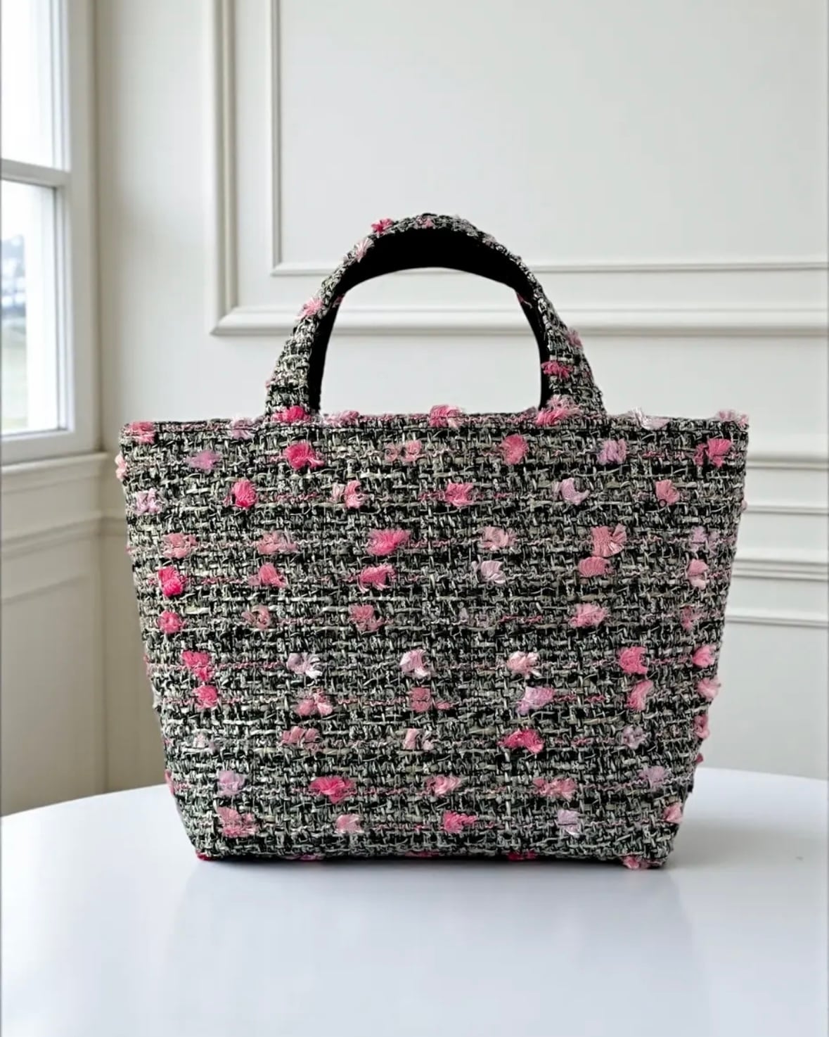ホワイトやクリームのループヤーンに、 ラズベリーやローズピンクの華やかな 色合いが織り交ぜられ、 ゴールドブロンズのラメ糸のチェックが 気品を添える、上質なツイード。 生地はオランダ ワイズネーションの 高級ツイードを使用。 マチが広めなので長財布、ポーチ、携帯、 ペットポトルも入ります。 マグネットボタンで開閉できるので 中身が見える心配もいりません。 中布は発色が美しいピンクベージュの シャンタンを使用。 内ポケットがひとつありパスケースなどを 収納できます。 ◆持ち手タイプ ◆ (※お好みに合わせてご選択ください) ・全面ツイード:華やかでラグジュアリー。 ・内側人工皮革:日本製〈ウルトラスエード〉使用。耐久性が高く、長時間持っていても手にやさしい仕様。 ◆金具カラー◆ ゴールドかシルバーのどちらか、 お好みのカラーをご選択ください。 【オプション:底鋲】 ツイードが擦れないように底に鋲を 追加する事ができます。追加料金+¥1,200 ★ご自身へのご褒美にはもちろん、大切な方へのクリスマスギフトとしてもおすすめです。 ⚫︎サイズ 高さ約21cm底マチ14cm底幅22cm 持ち手長さ 約28cm ⚫︎表生地:コットン49%、ナイロン34%、ポリエステル17% ⚫︎裏地:レーヨン100% ※受注製作のため、発送まで一週間ほどお時間をいただいております。 ※ご覧頂いているパソコンや端末によって実物とお色味が異なって見える場合がありますのでご了承くださいませ。 ※ツイード生地は甘撚りで織られた繊細な織物です。 引っ掛けには十分ご注意くださいませ。