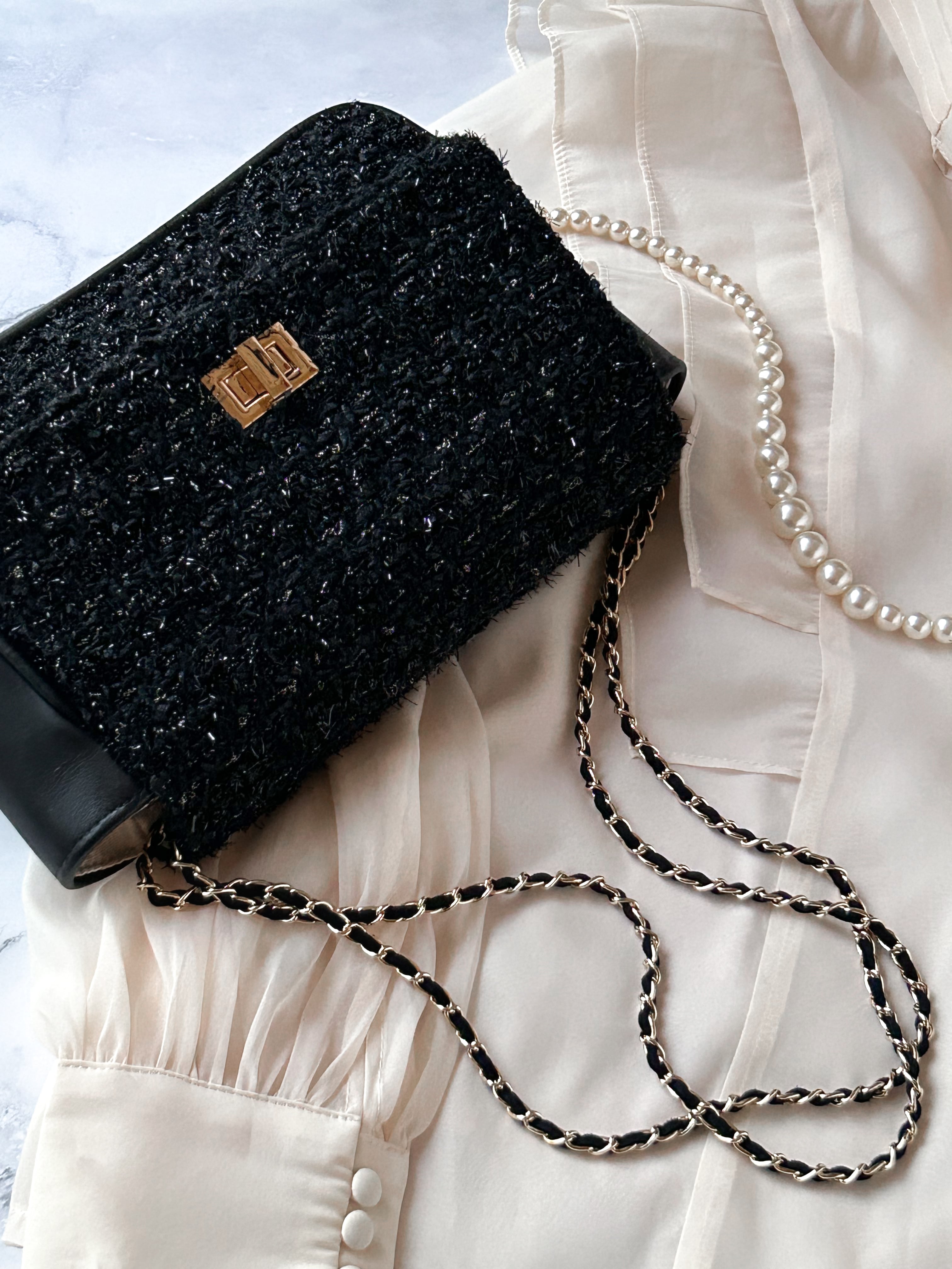 ミニ巾着バッグ 黒×シルバー ツイード|2WAY 大人のお出掛け・クリスマス・ご褒美バッグ