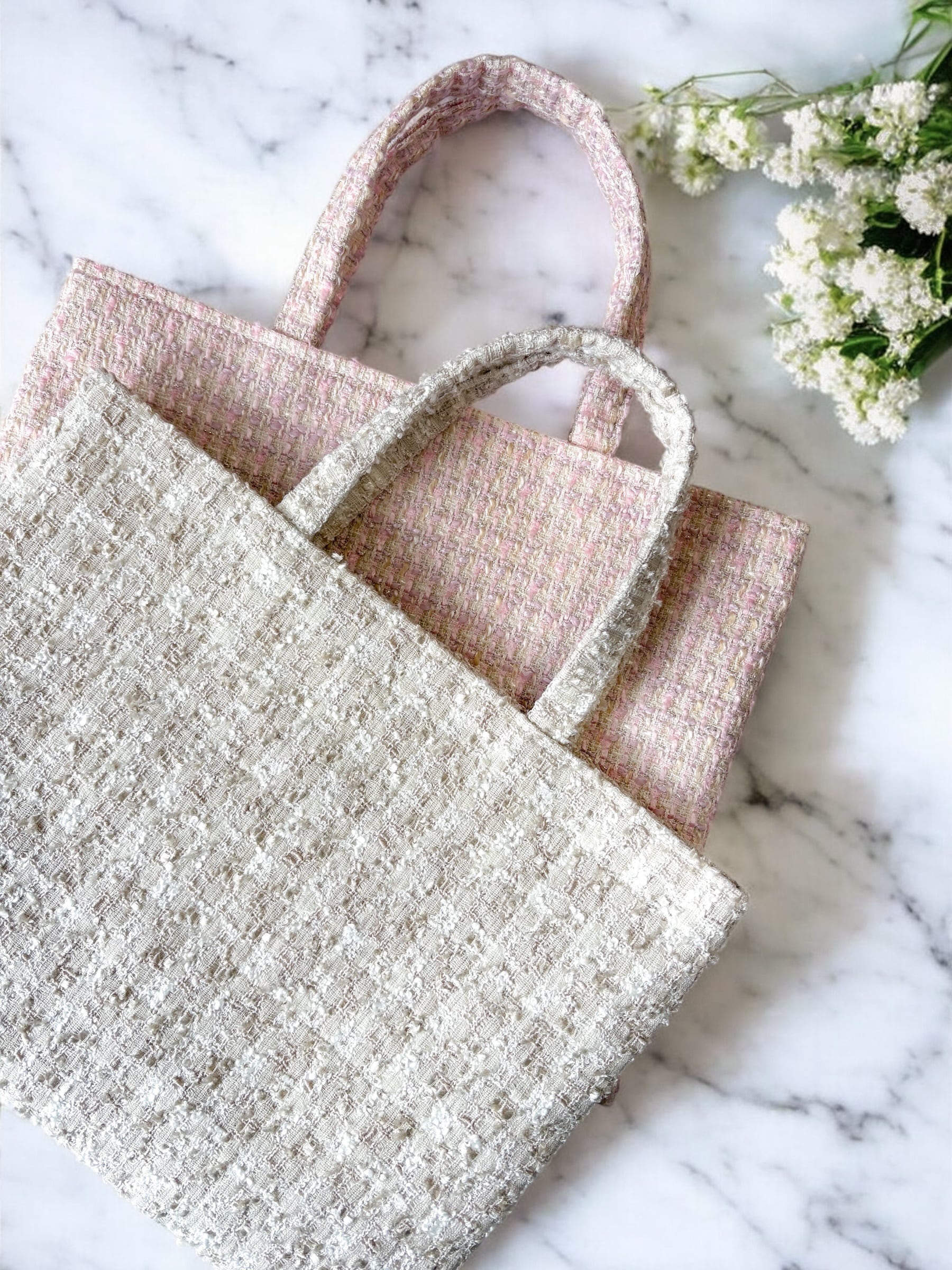 アイボリーを基調に、やさしいピンクが溶け込む上品なツイード。 生地には、尾州の老舗メーカー Miros社の高級ツイード を使用。 淡くやわらかな色合いが、装いをやさしく引き立てます。 シンプルなデザインで、どんなコーディネートにも馴染み、レッスンバッグやサブバッグとしても活躍します。 口元はマグネットボタン付きで開閉もスムーズ。 内側には上品なピンクベージュのシャンタンを合わせ、バッグを開くたび、さりげないときめきを。 内ポケット付きで、パスケースやスマホなどの小物もすっきり収納。 装いを選ばず、日常にもやさしく馴染む。 それでいて、きちんと美しい。 メインバッグと合わせてお持ちいただいても、すっきりと上品にまとまります。 ⚫︎サイズ 高さ 約26cm 横幅 約36cm 持ち手長さ約35cm ⚫︎表生地:混紡生地 ⚫︎裏地:レーヨン100% ご注文より3日以内に発送いたします。 春の式典シーズンにもゆとりをもってご準備いただけます。 ※ご覧頂いているパソコンやモニター環境によって実物とお色味が異なって見える場合がありますのでご了承くださいませ。 ※ツイード生地は甘撚りで織られた繊細な織物です。 引っ掛けには十分ご注意くださいませ。