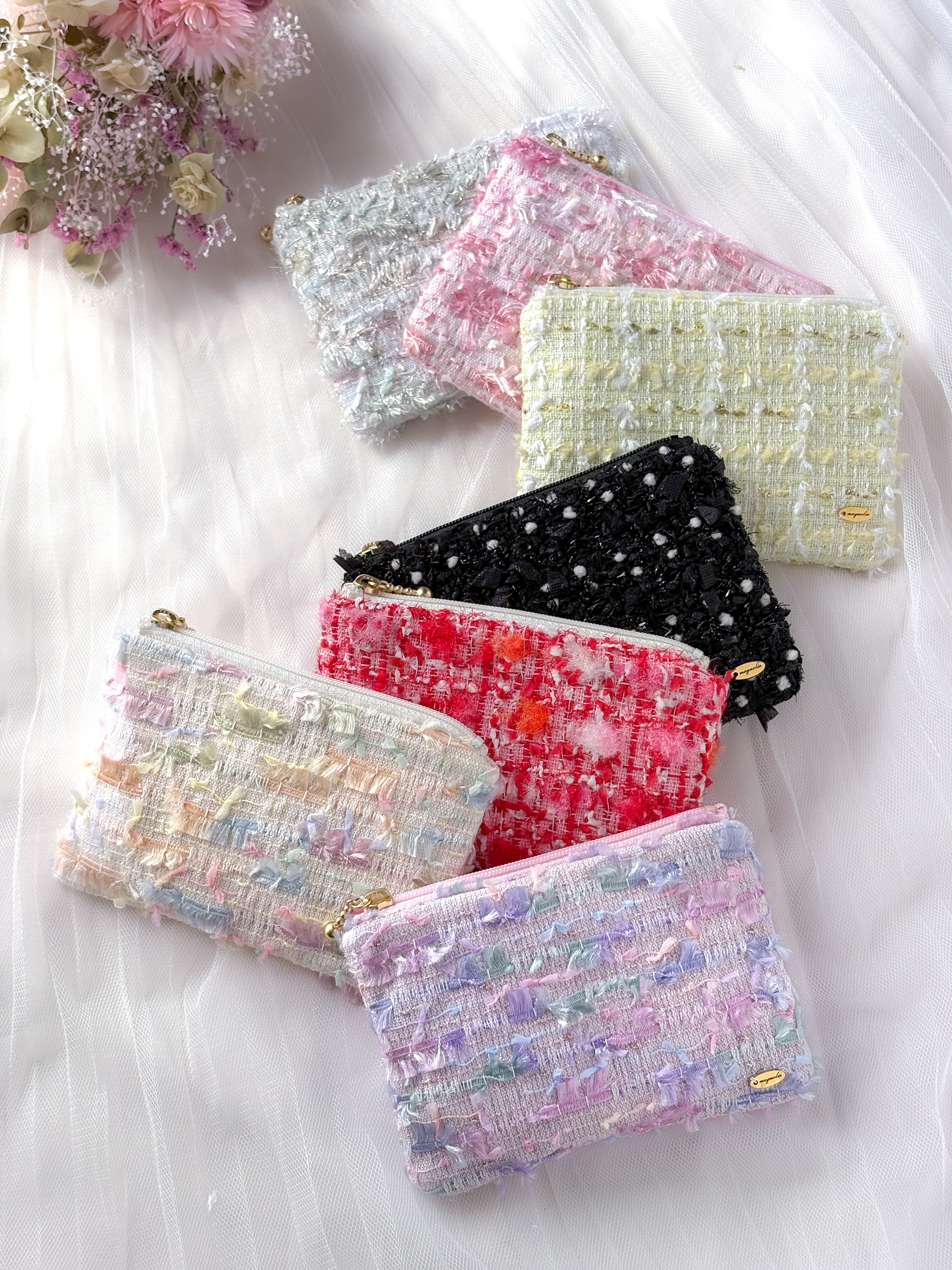 春の新生活に、ポーチも新しくしませんか? バッグを開けるたび、ちょっと気分が上がる。 そんな小さな華やぎを ツイードで仕立てたミニポーチです。 春の柔らかな光に溶け込む、 甘すぎず品良く華やぐ大人カラー。 上質な国産 Miros社のジュエリーツイードを贅沢に使用。 内布は、大人に似合うくすみピンクを合わせ、 開けたときも品よく、エレガントな色合いを楽しめます。 手にするたび、心が弾むようなエレガントな ミニポーチ。 一点一点、丹精込めてお仕立てしました。 12cmファスナーのコンパクトサイズは ミニトートや小ぶりのバッグにも、 すっきり収まるサイズ感です。 春の柔らかな彩りをそっと閉じ込めた、 ツイードの魅力あふれるフラットポーチです。 リップや目薬、ICカードなど、 “小さな必需品”をすっきり整理。 ポケットはあえて付けず、 ミニサイズならではの軽やかさを大切にしました。 ご自身へのご褒美にはもちろん、 ギフトにもおすすめ。 有料ギフトラッピング(+150円)も承ります。 バッグを開けるたびに気分が上がる。 コンパクトなエレガントポーチです。 バッグの中にも、春のときめきを。 ▼ 別売のホワイトミニトートはこちら https://magnolie.theshop.jp/items/137883613 ─────────────── サイズ 高さ 約9.5cm × 横 約13cm ファスナー:12cm 表生地:混紡素材 裏地:レーヨン100% ─────────────── 【配送に関するご注意】 2点以上、ラッピングをご希望の方は、厚みの関係で宅急便での発送となります。 その場合は、配送方法で「宅急便」をお選びください。 こちらの商品はご入金確認後、3日以内に発送いたします。 ※洗濯は型崩れや色落ちの原因となりますのでお控えください。 ※ご覧の端末により実物と色味が異なる場合がございます。 ※ツイードは繊細な織物です。引っ掛けには十分ご注意くださいませ。