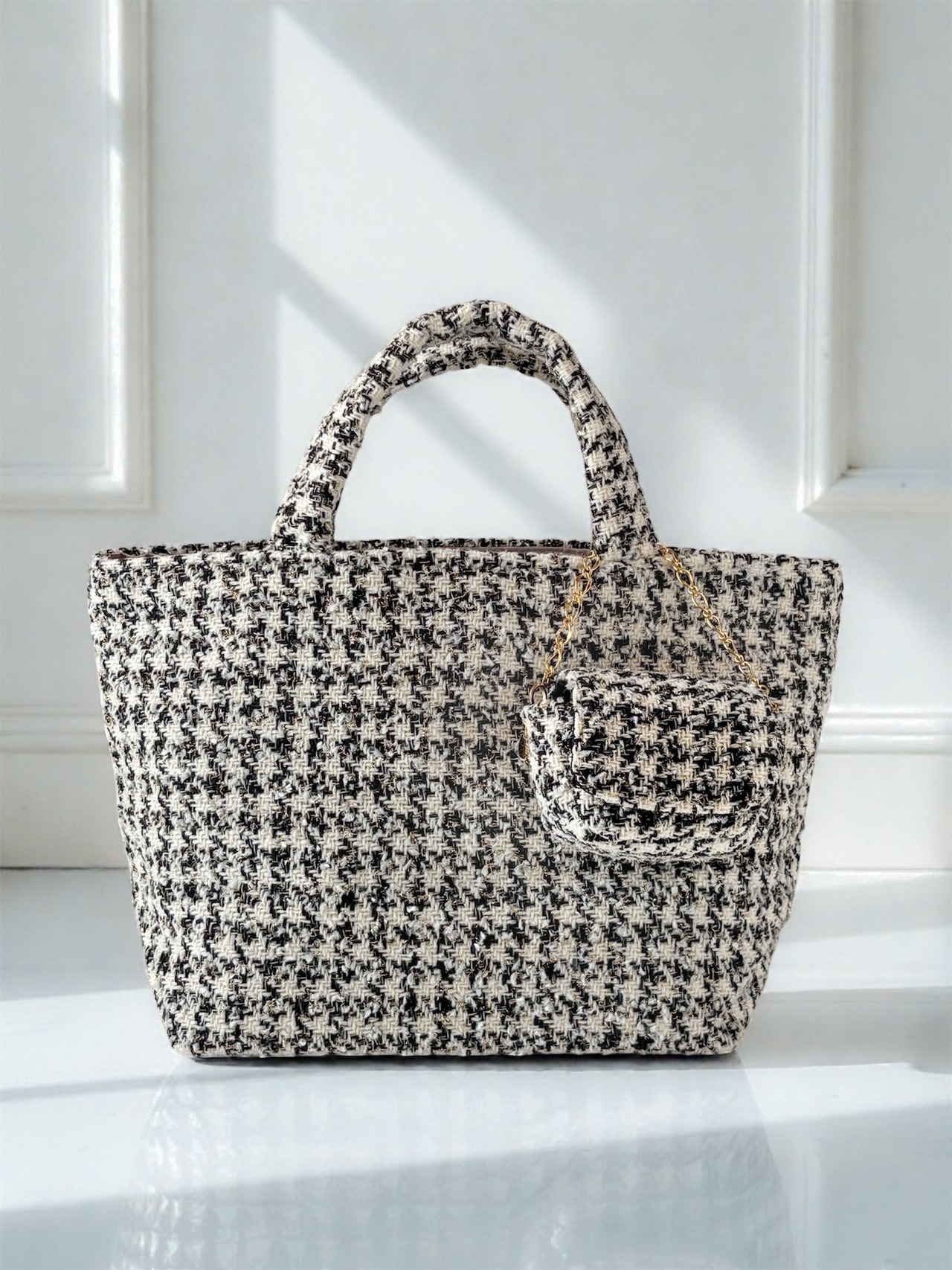 千鳥格子 モノトーン ツイード トートバッグ マチ広め・AirPodsケース付き|冬・クリスマス・ご褒美ギフト