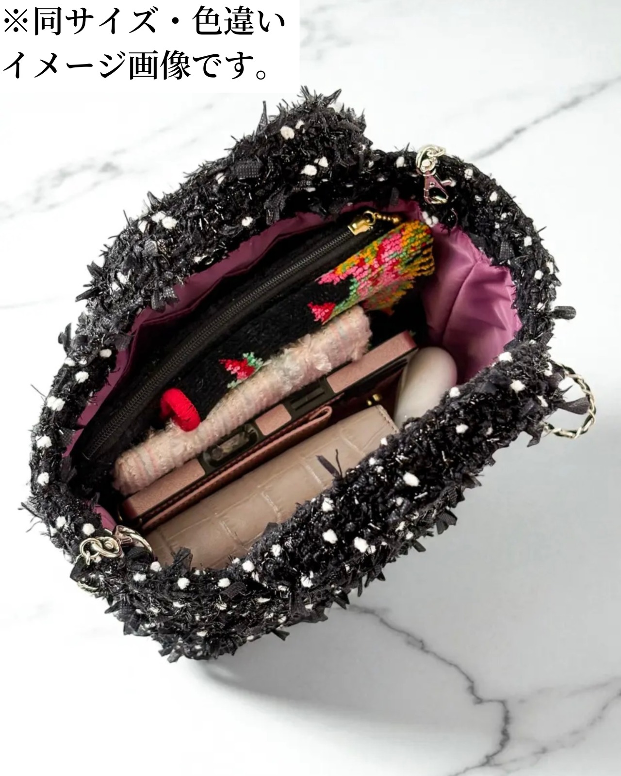 冬の装いに、凛とした華やぎのアクセントを添えるミニトート。