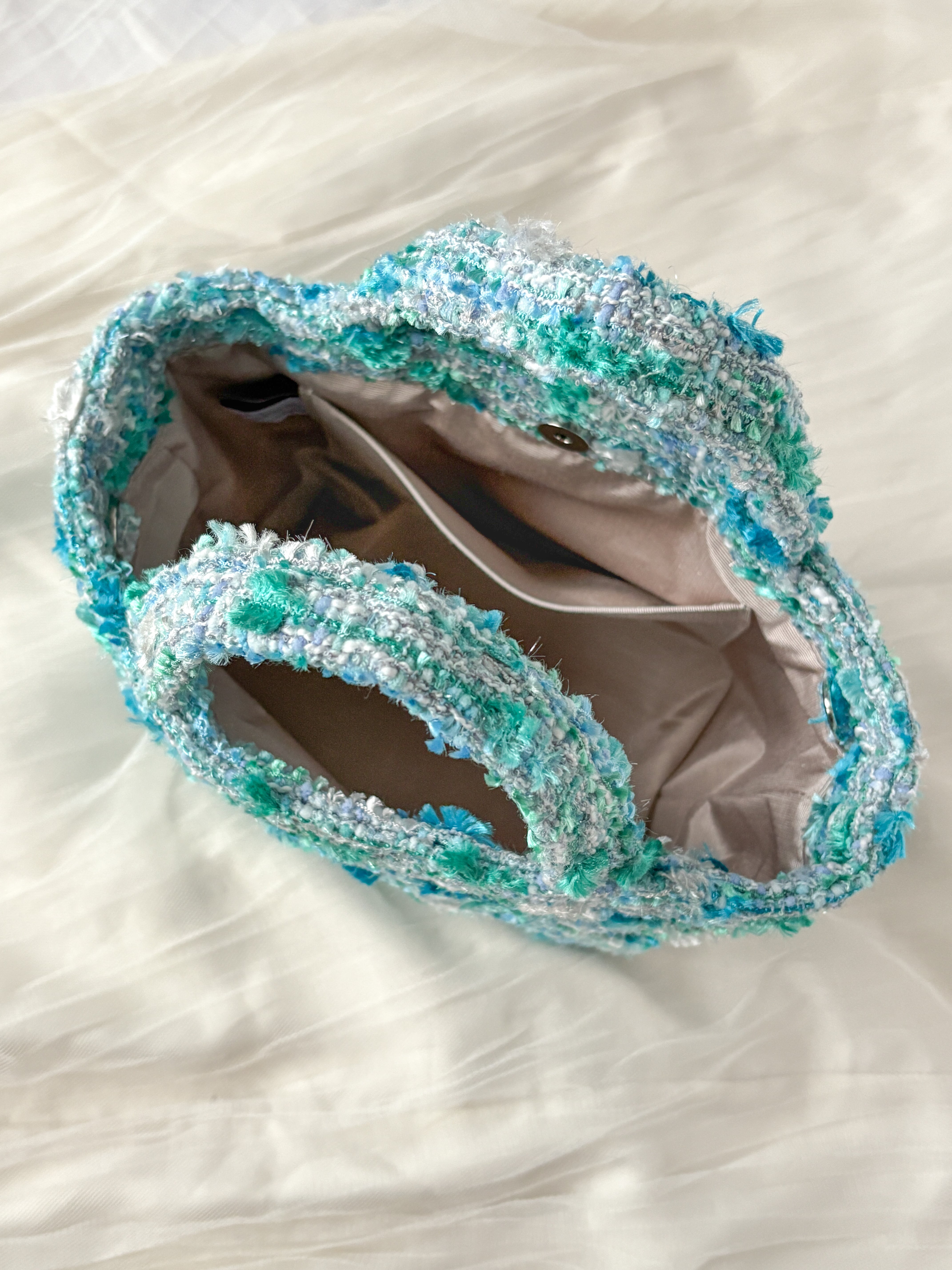 “希望の石“と呼ばれるアマゾナイトの美しさを、希少な高級フェザー糸で表現したブルーグリーンのジュエリーツイード。