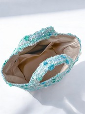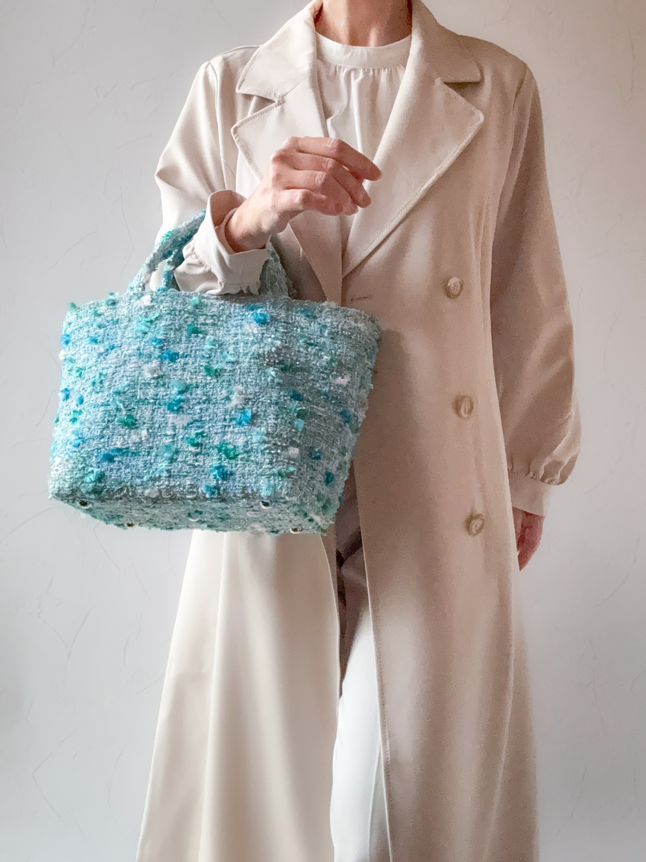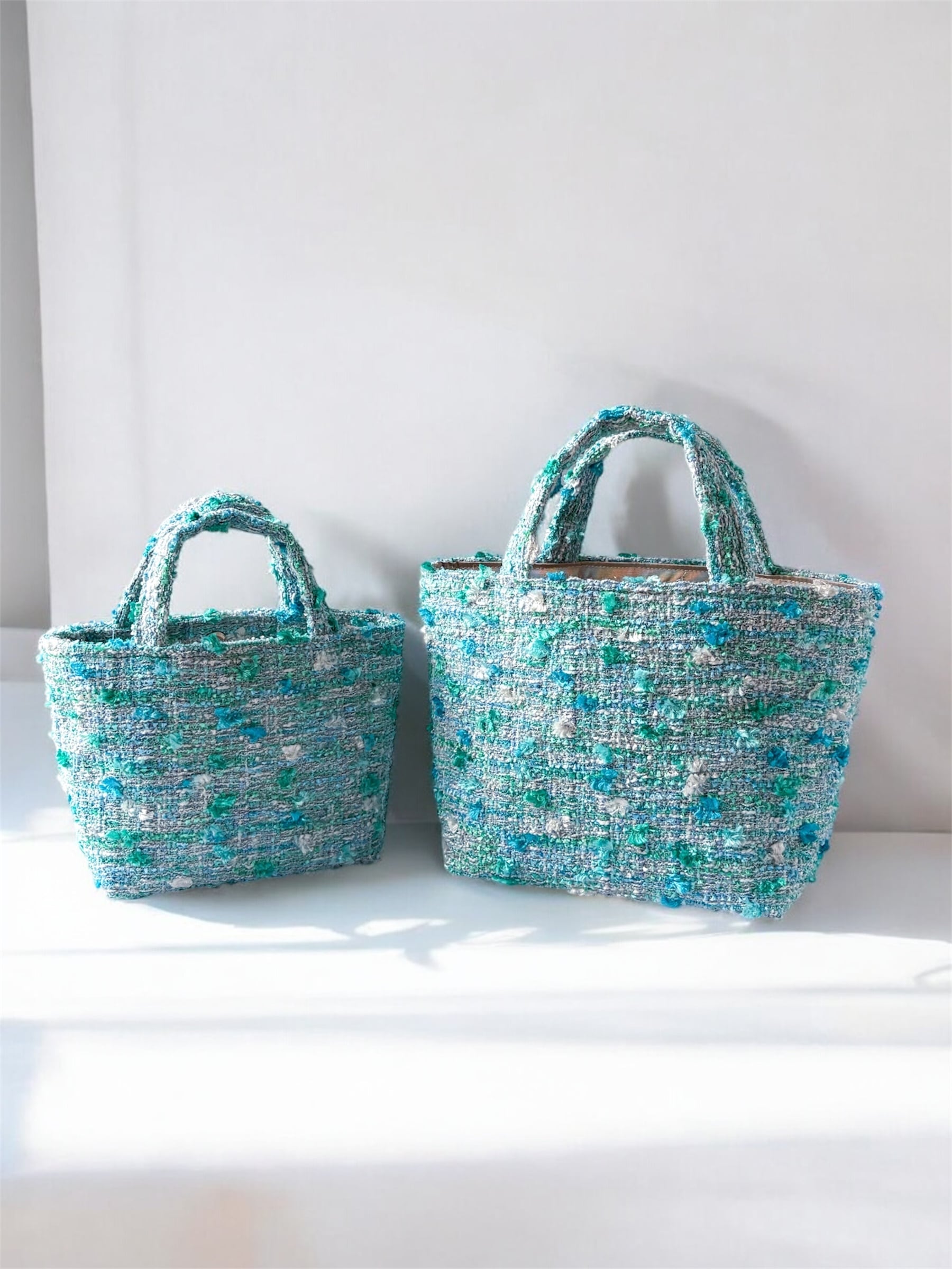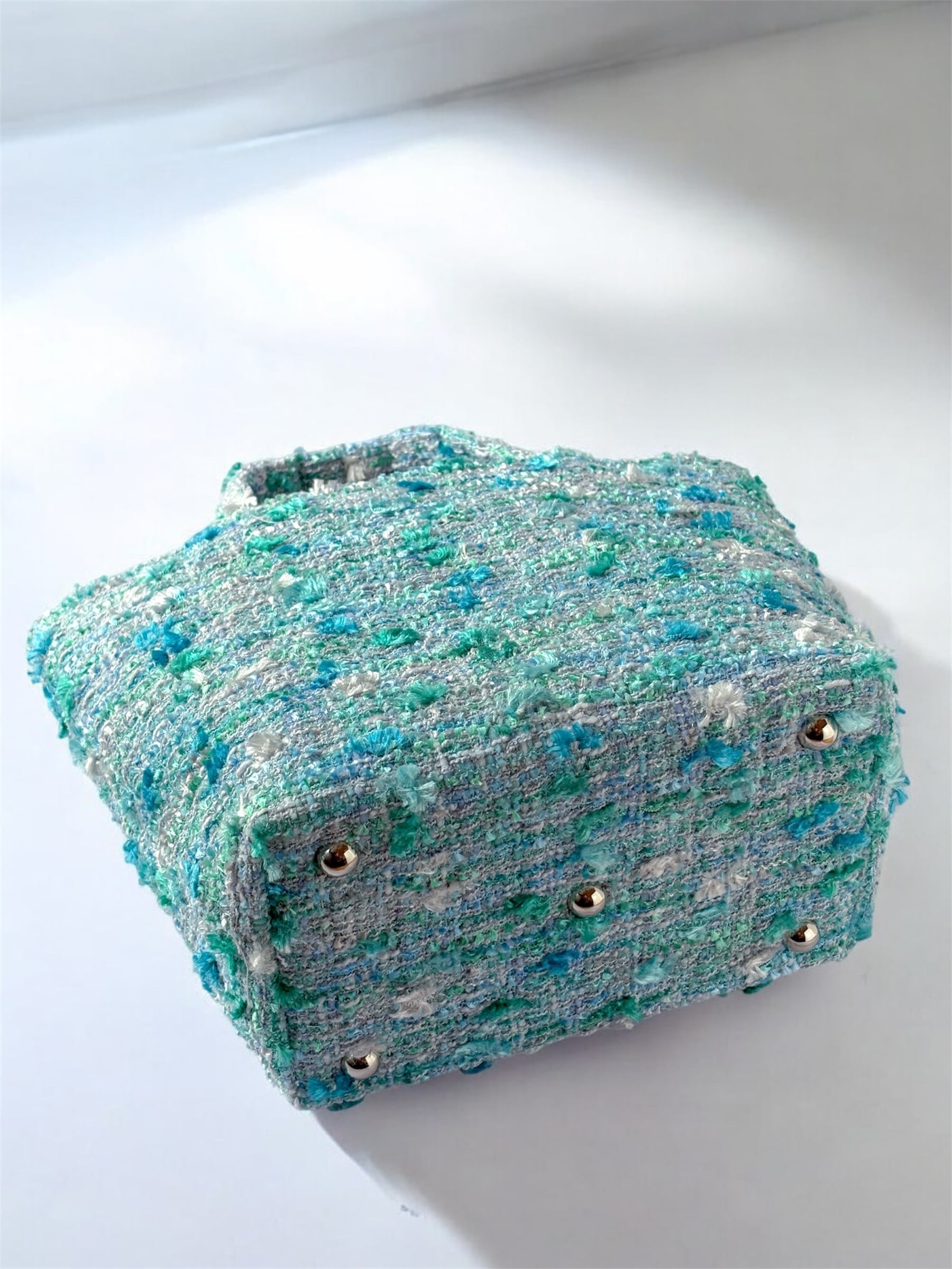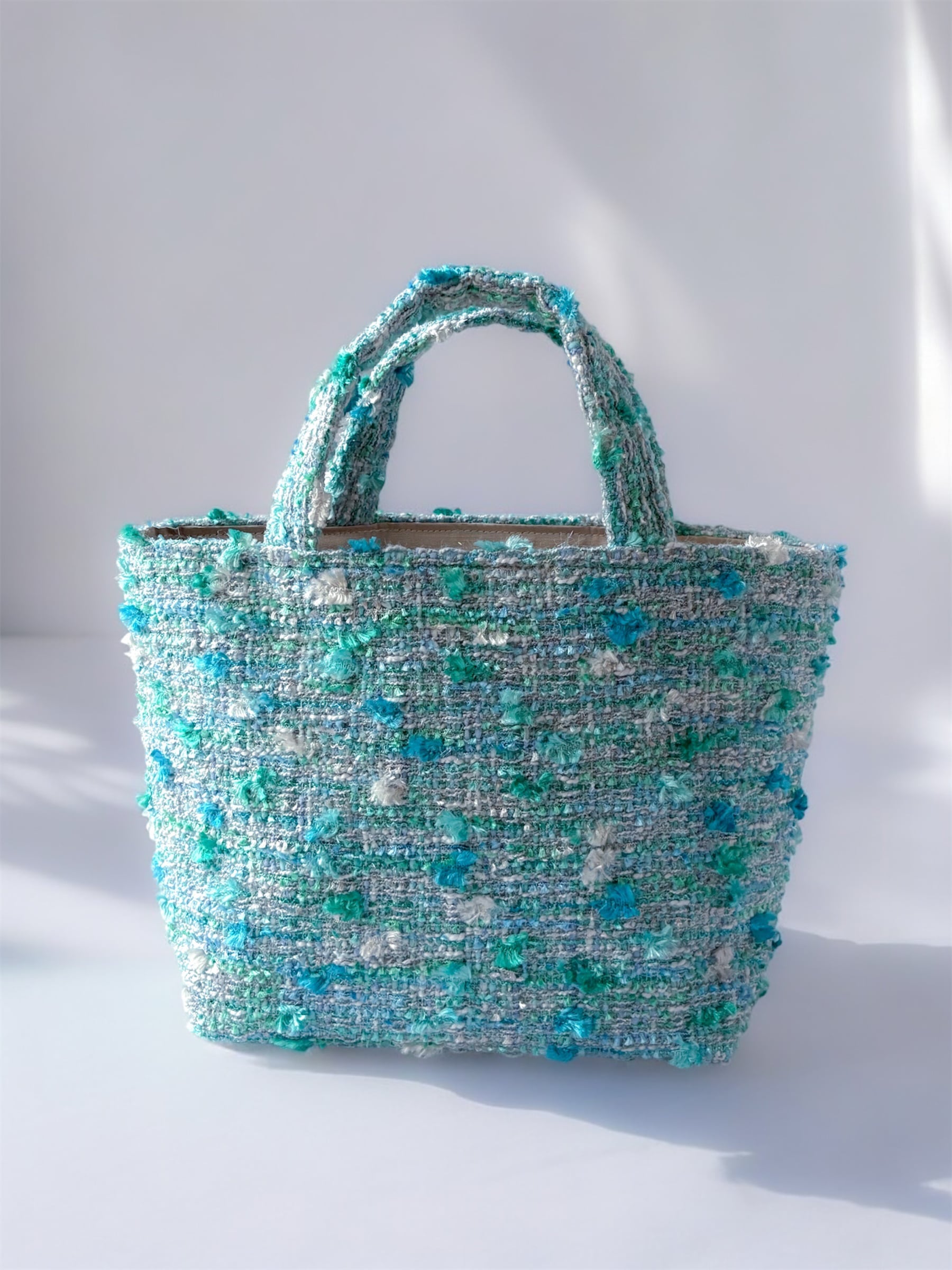ブルーグリーンツイード マチ広め トートバッグ Mサイズ 底鋲付き お出掛け ご褒美 プレゼント