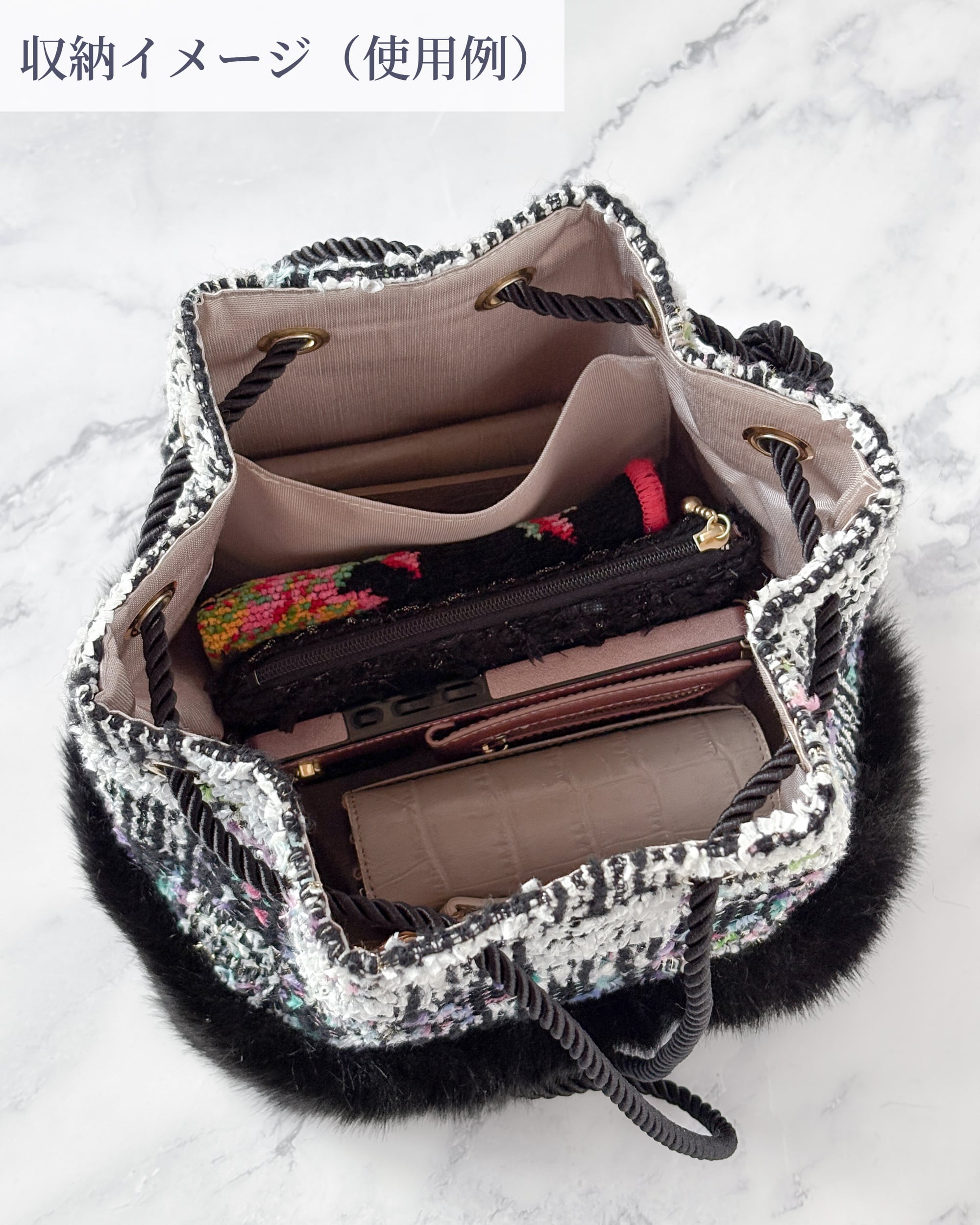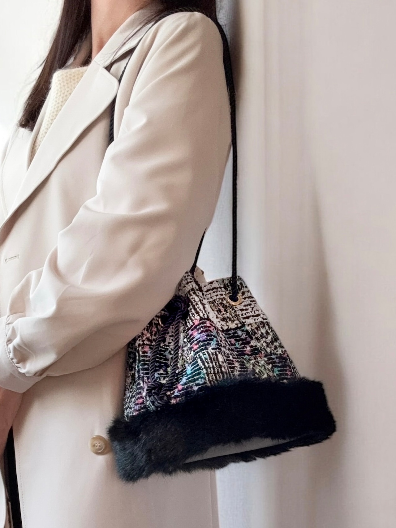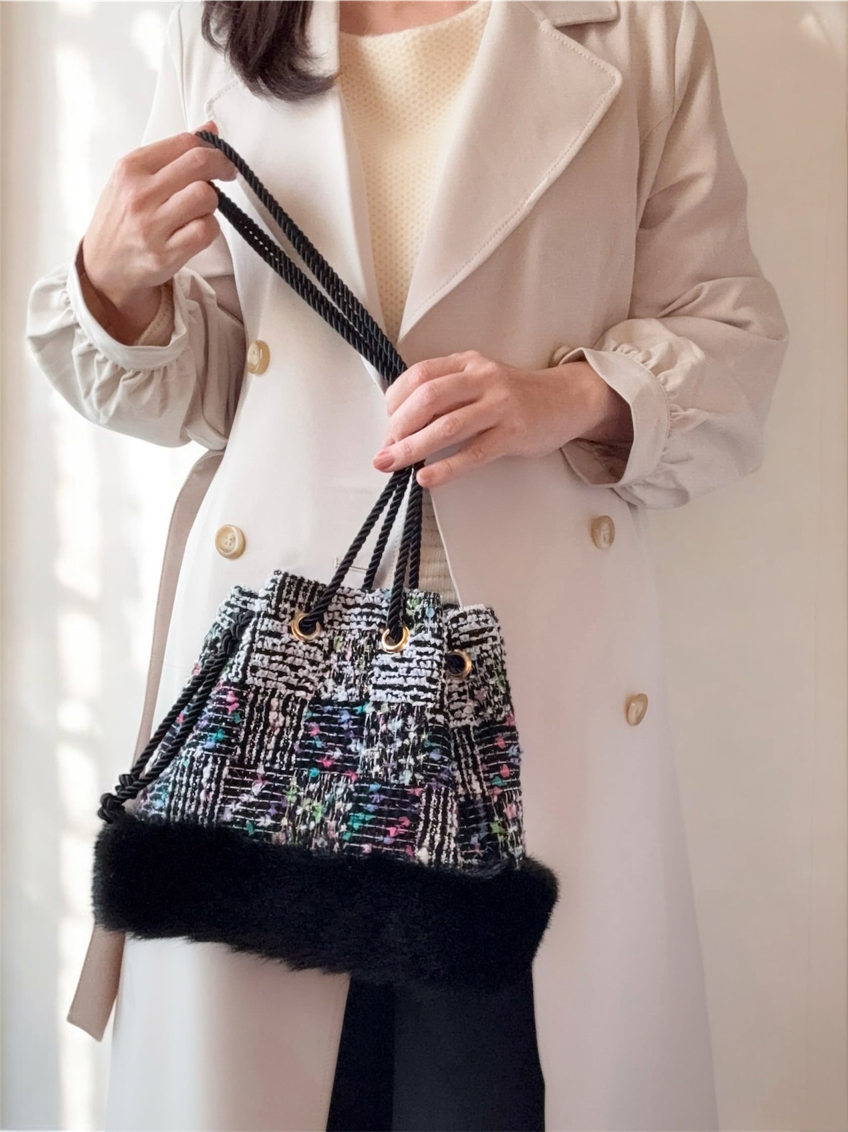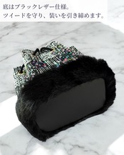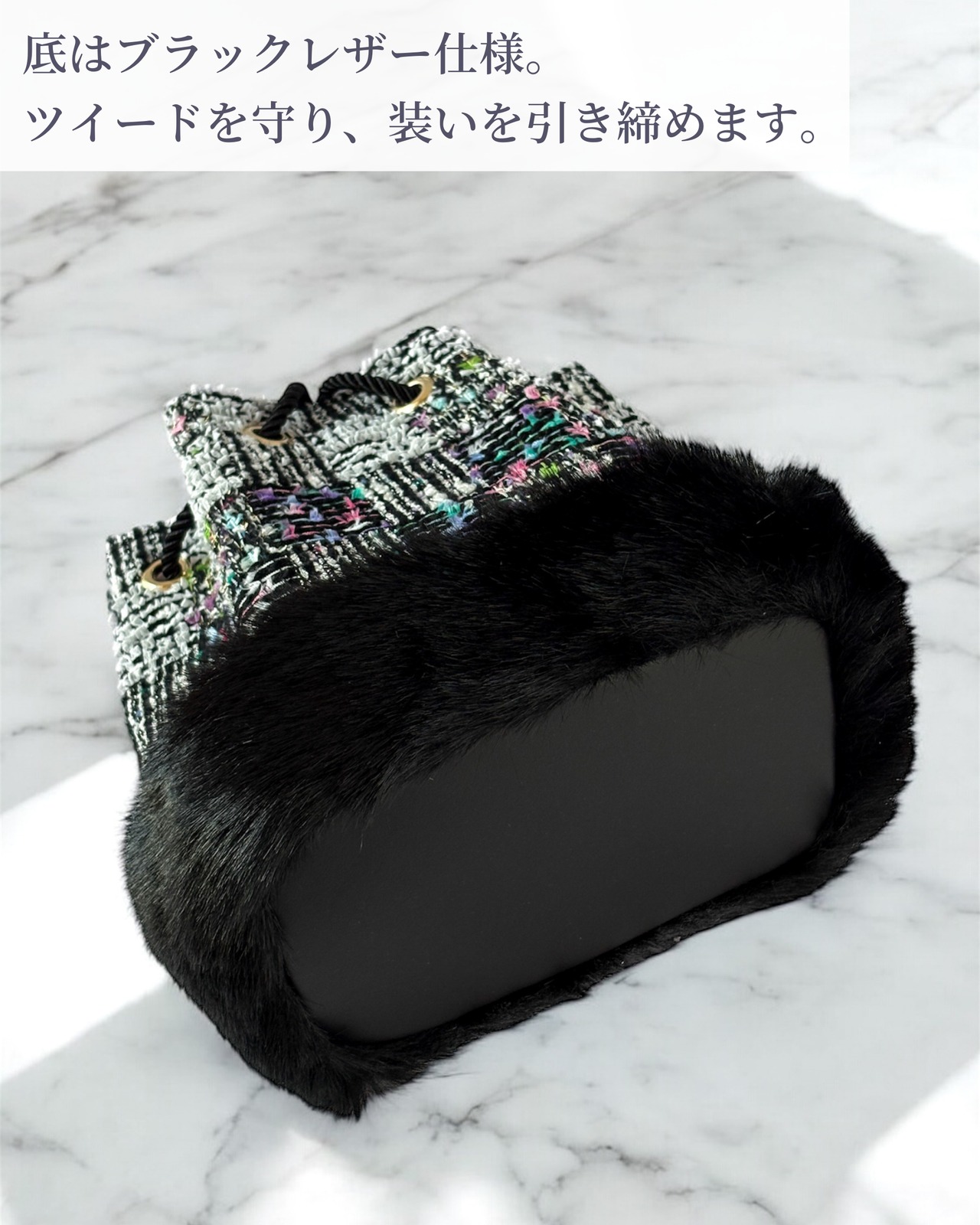 ファーミニ巾着バッグ ブラック 本革 ジュエリー ツイード お出掛け・ご褒美・プレゼントに