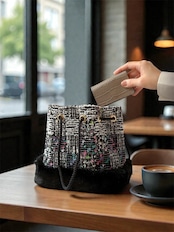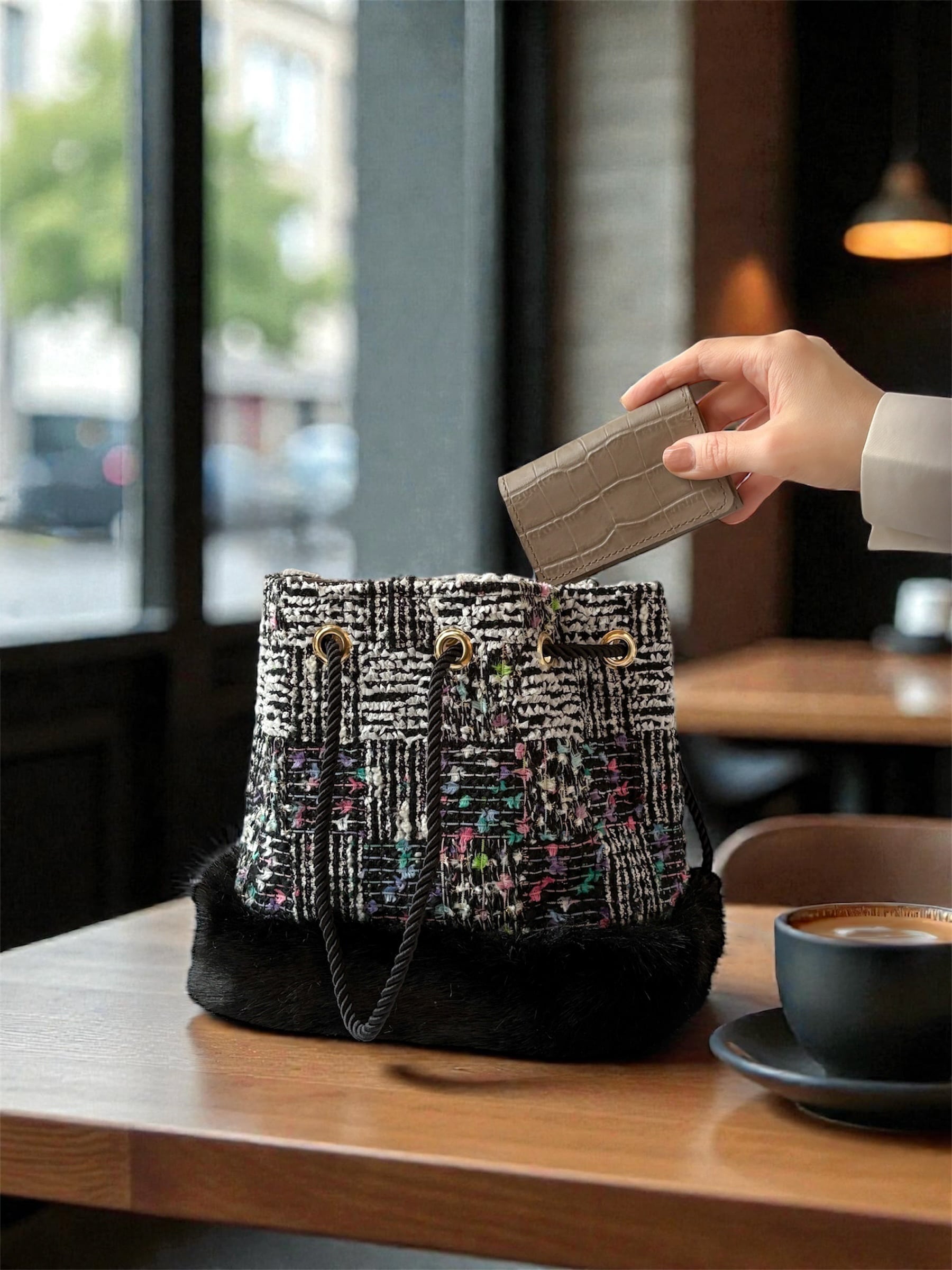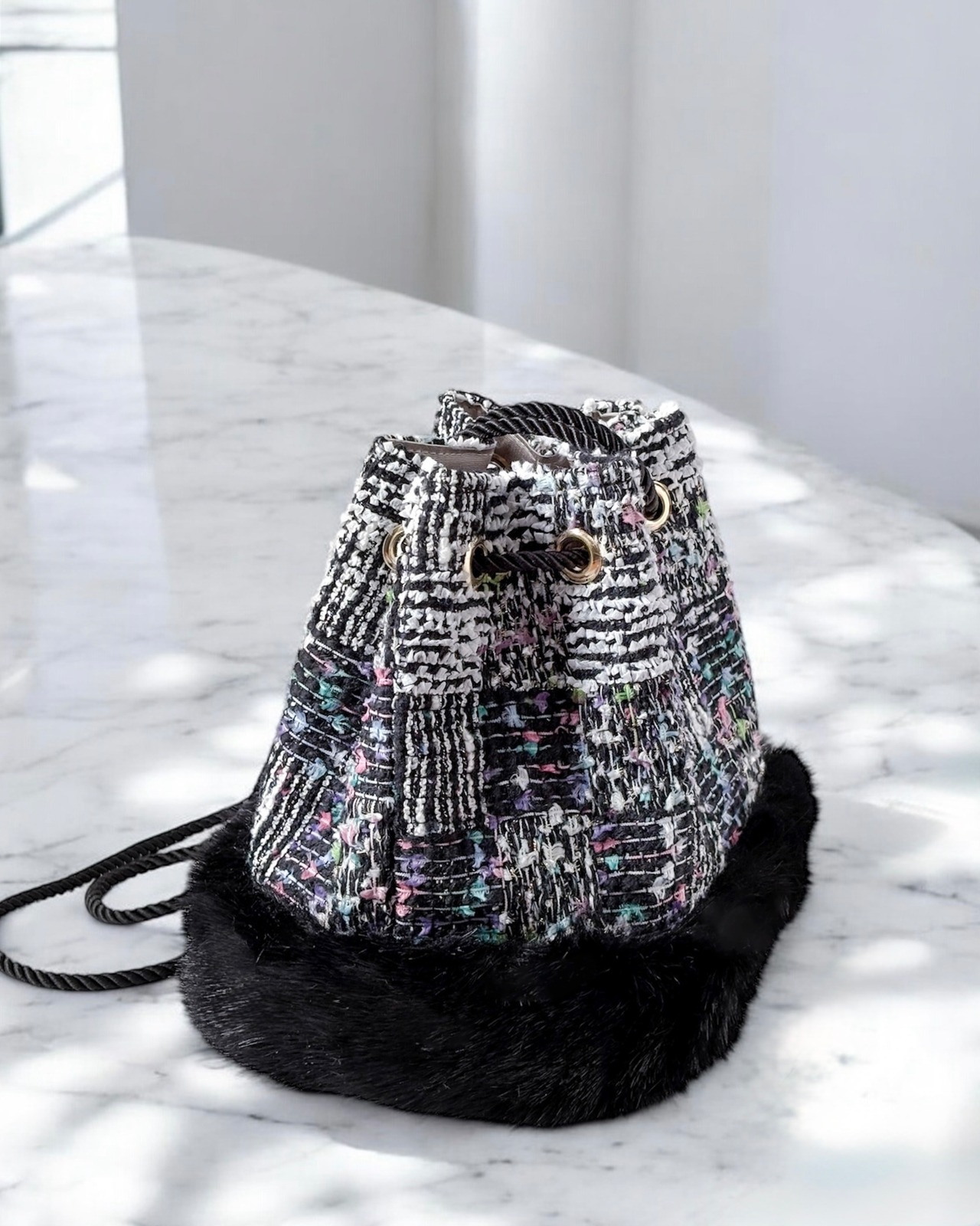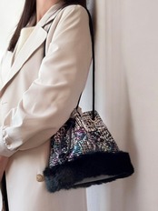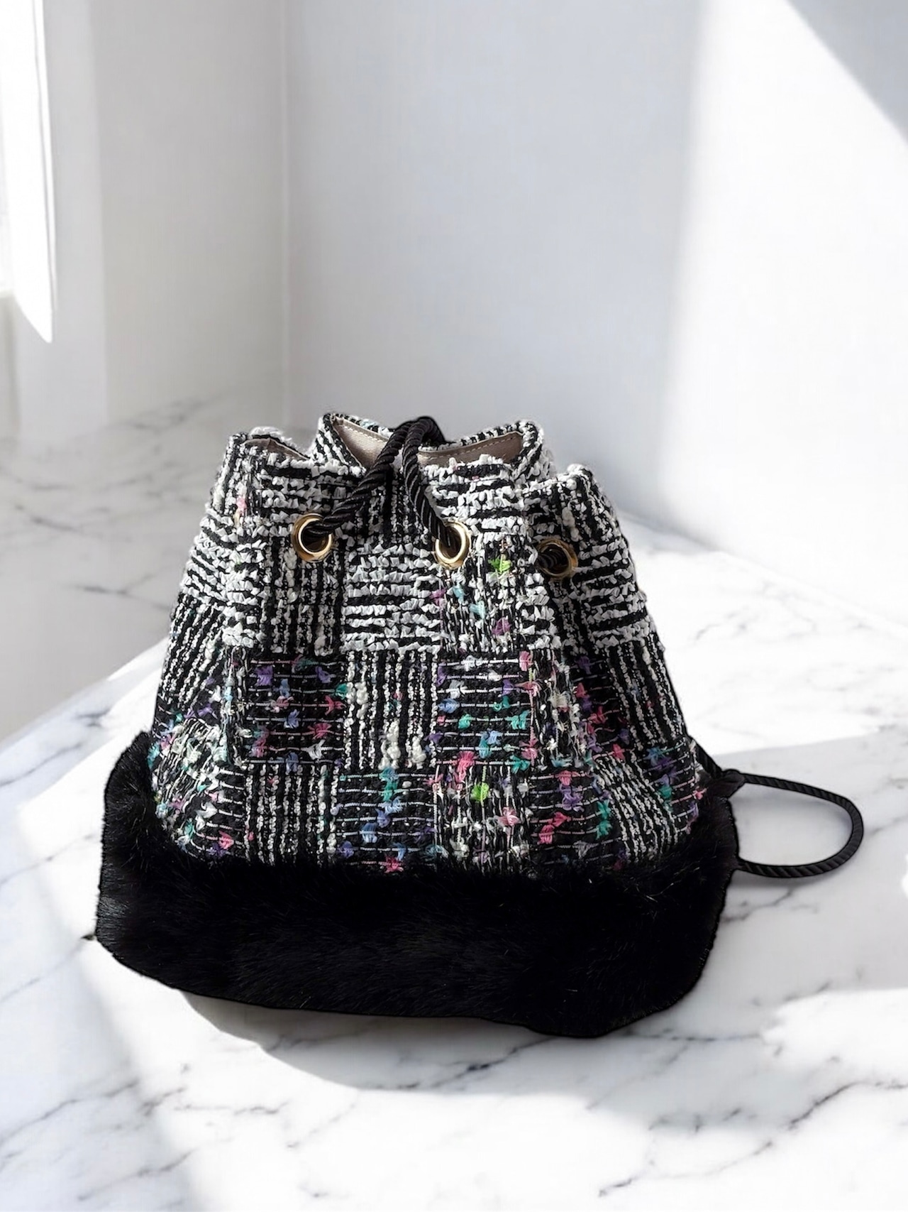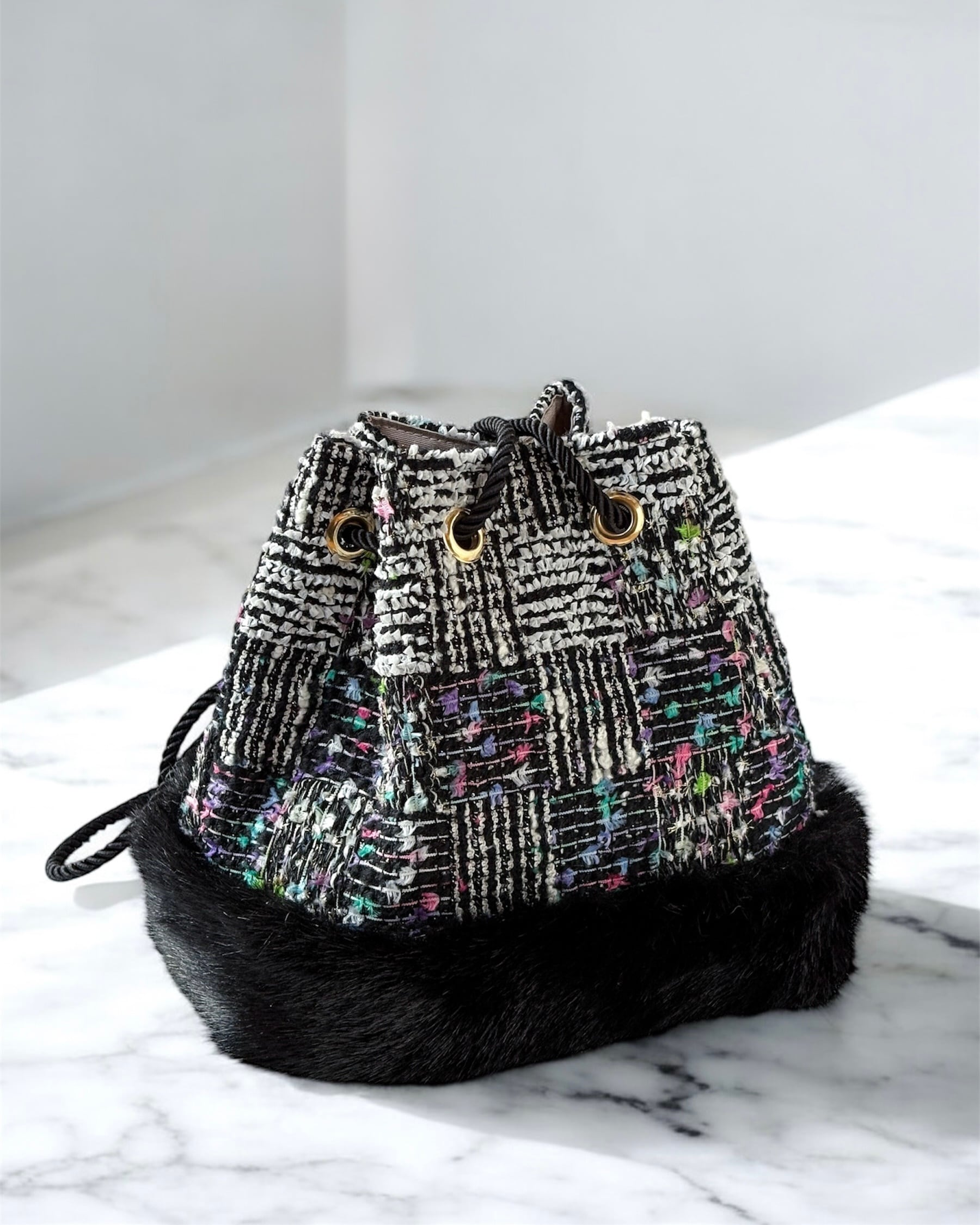 ファーミニ巾着バッグ ブラック 本革 ジュエリー ツイード お出掛け・ご褒美・プレゼントに