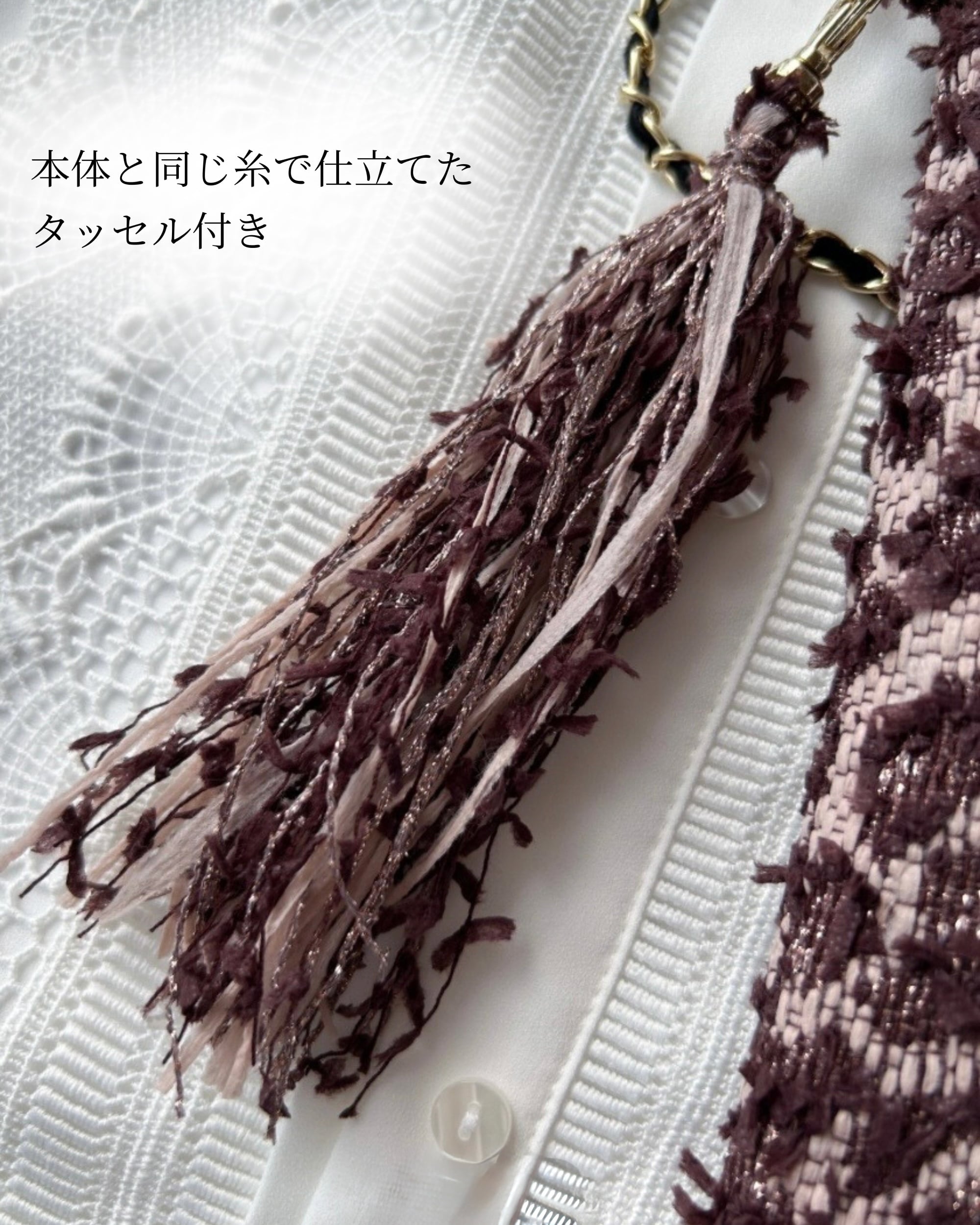 同じ糸で仕立てたタッセルが、統一感のある