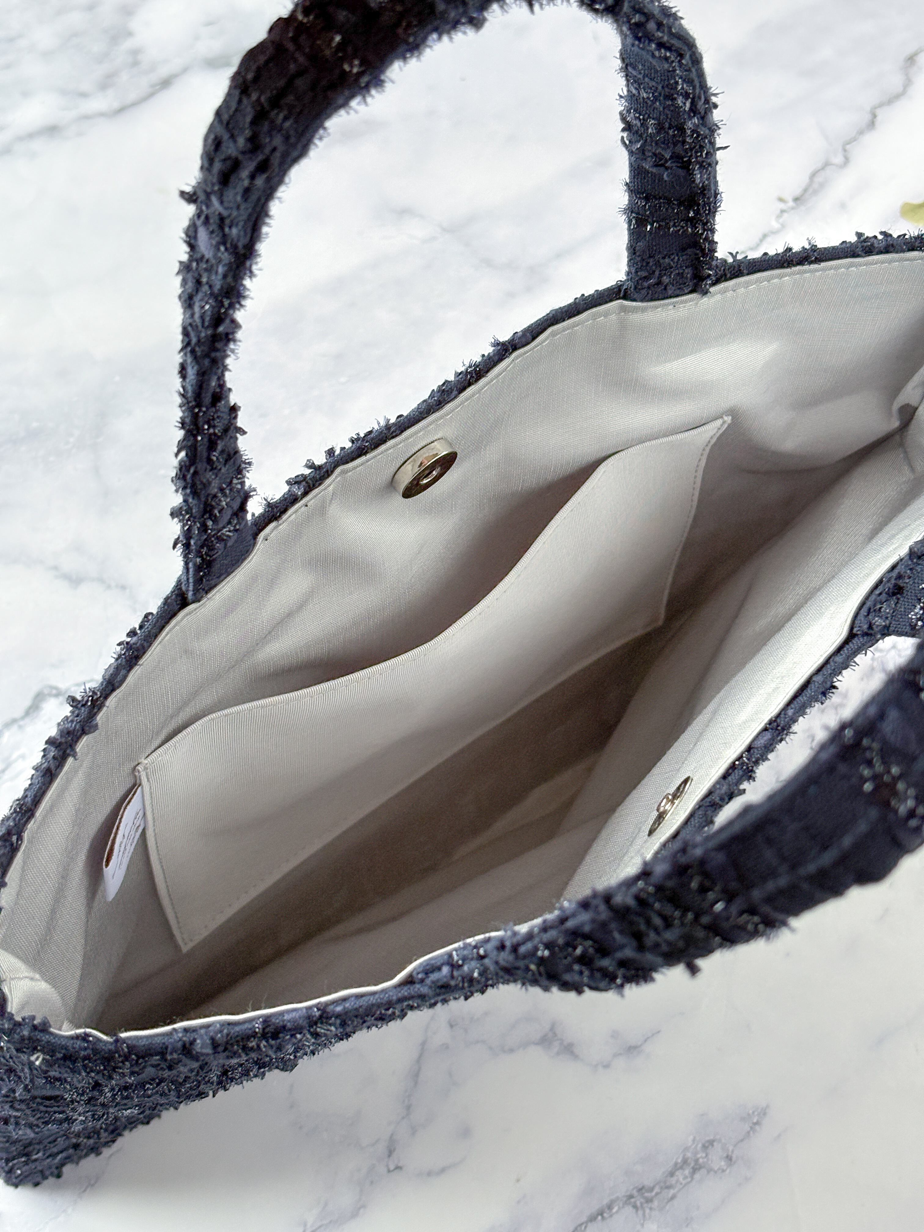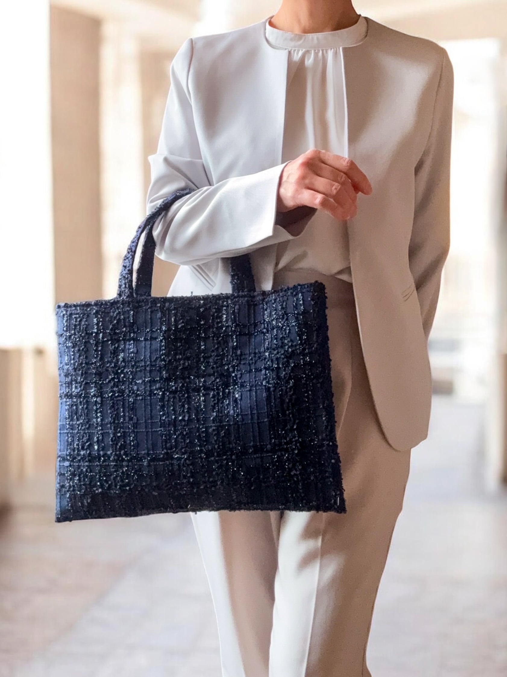きちんとした装いに寄り添う、ネイビーのフラットトート。