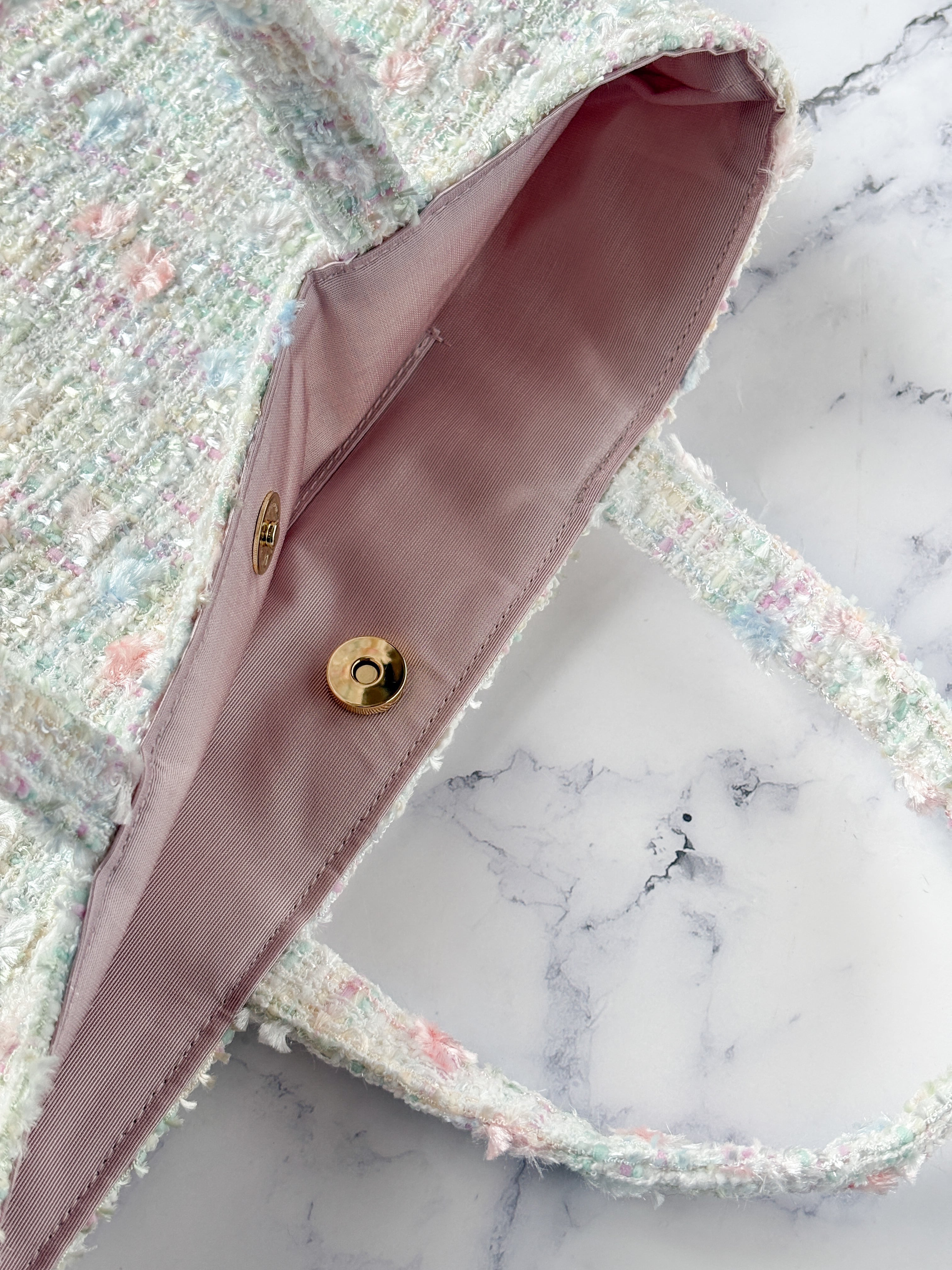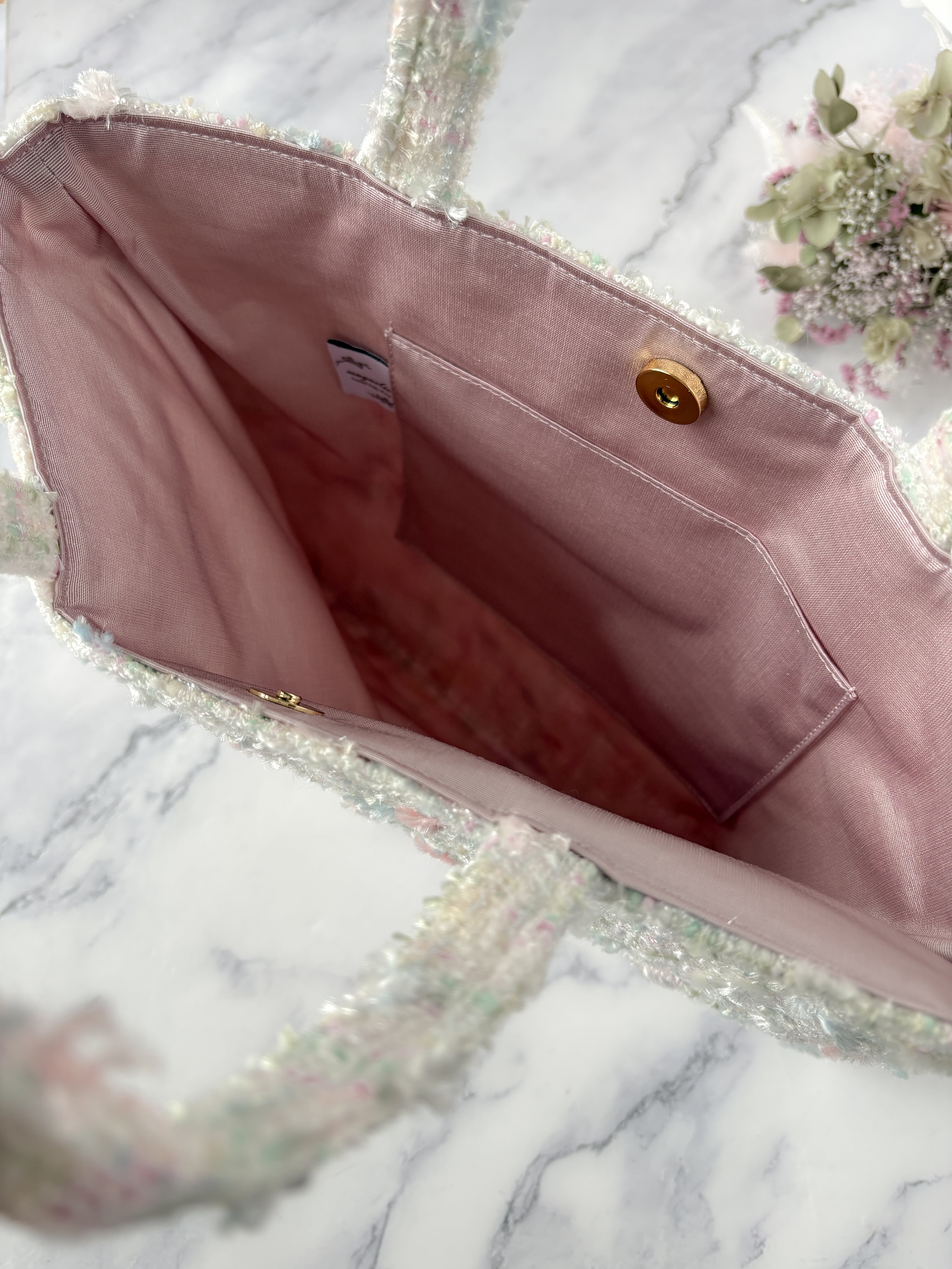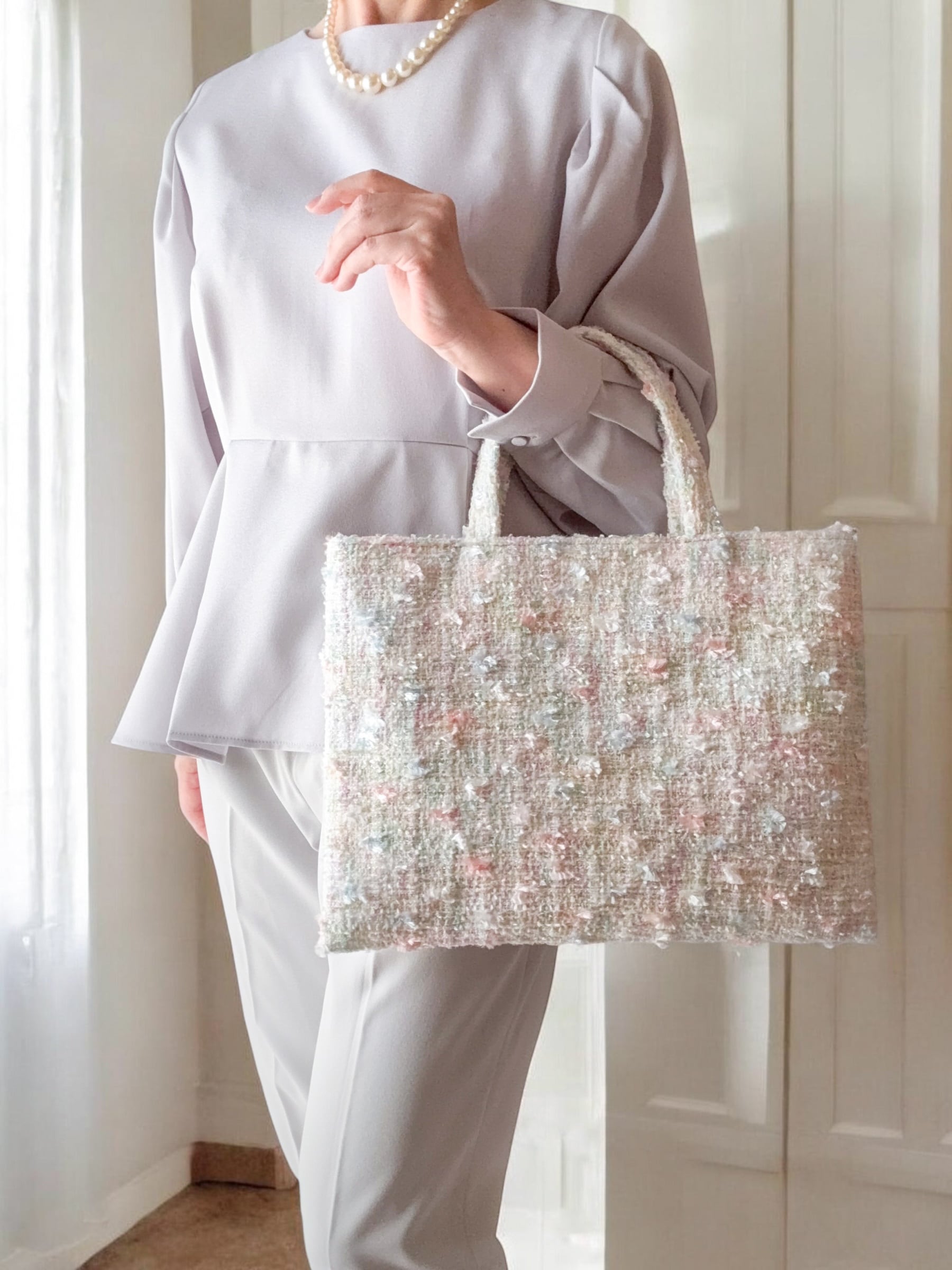 ホワイト A4 フラットトートバッグ パステル 白ツイード サブバッグ 卒園・入学式・セレモニー・サブバッグ レッスンバッグ プレゼントに♡