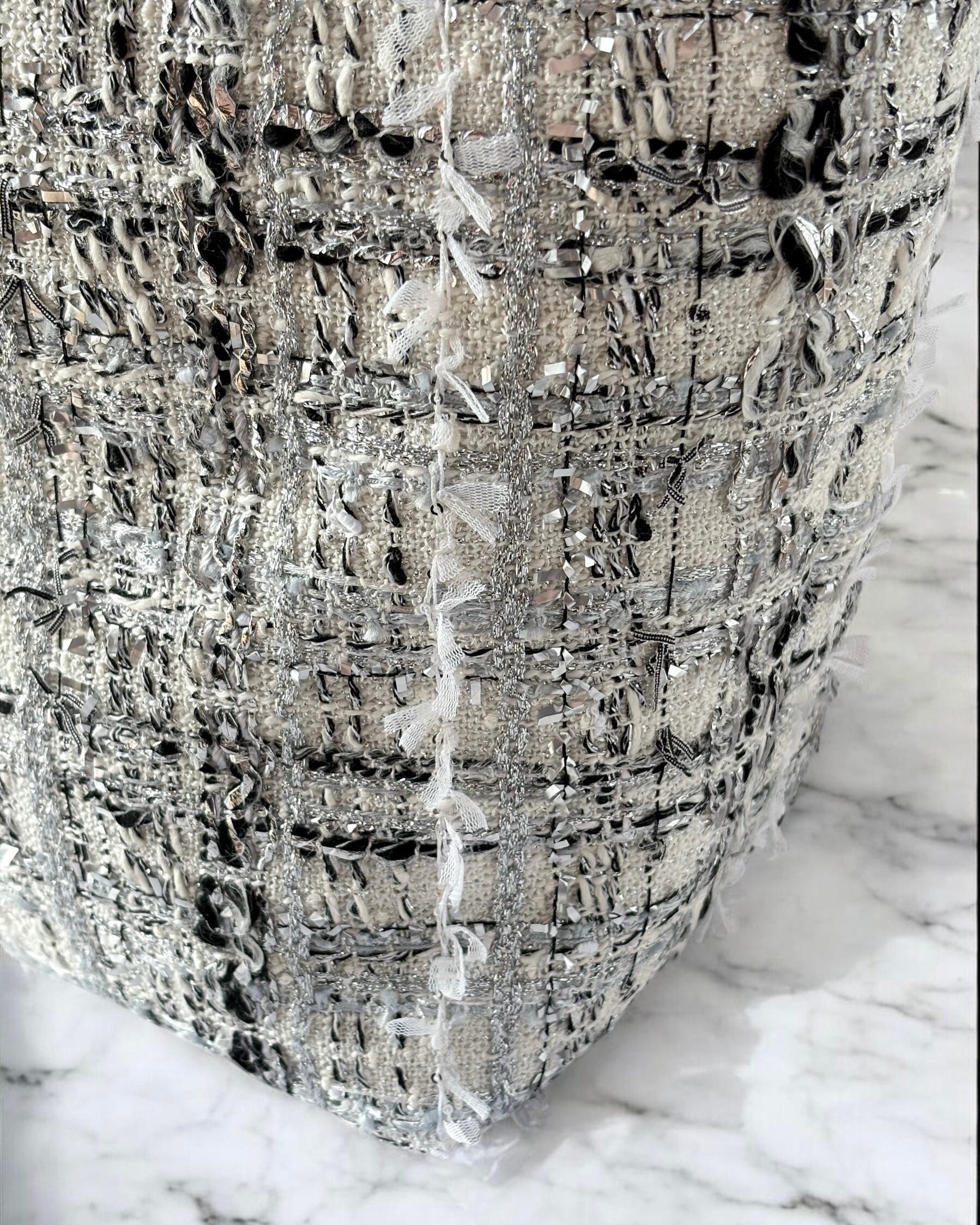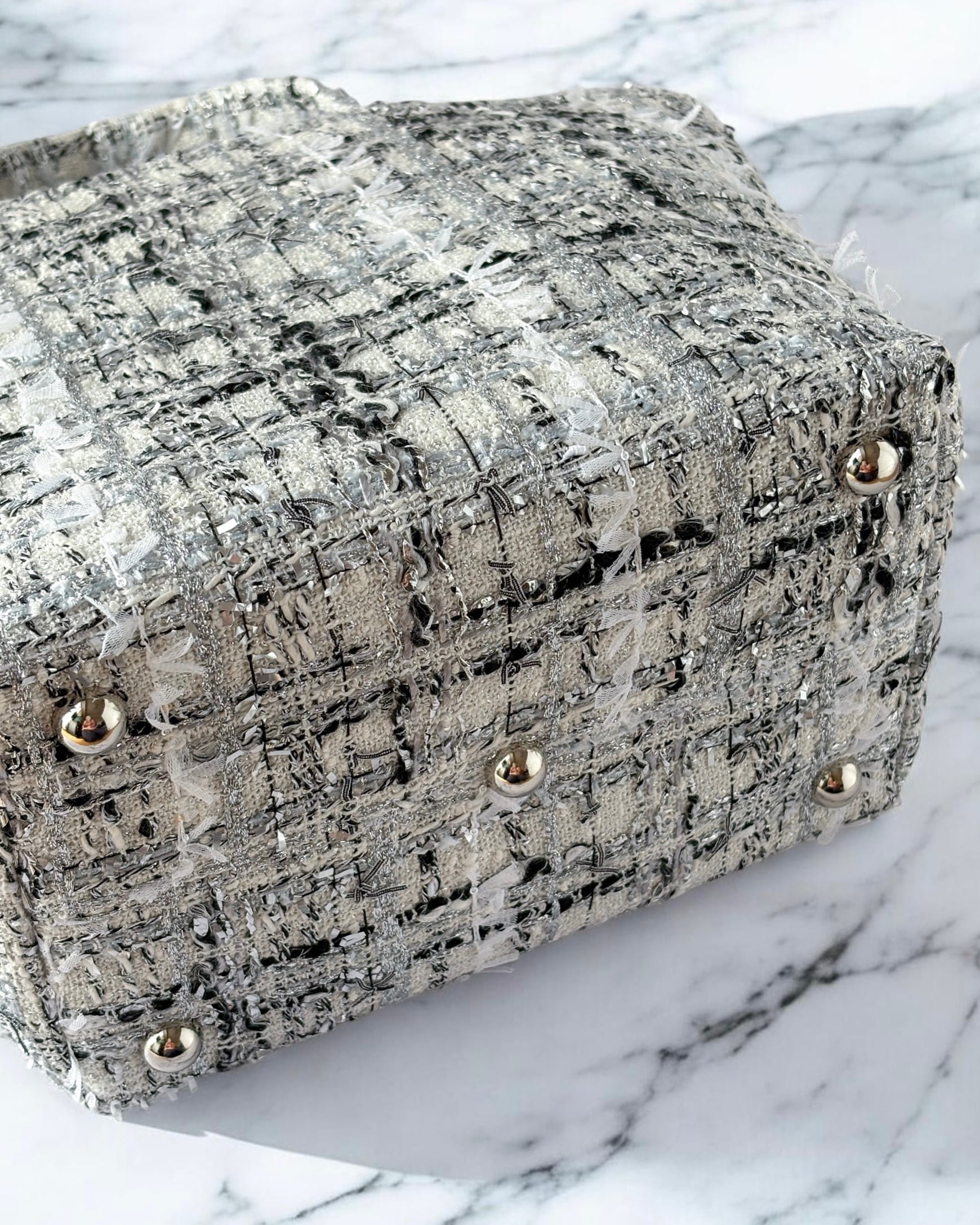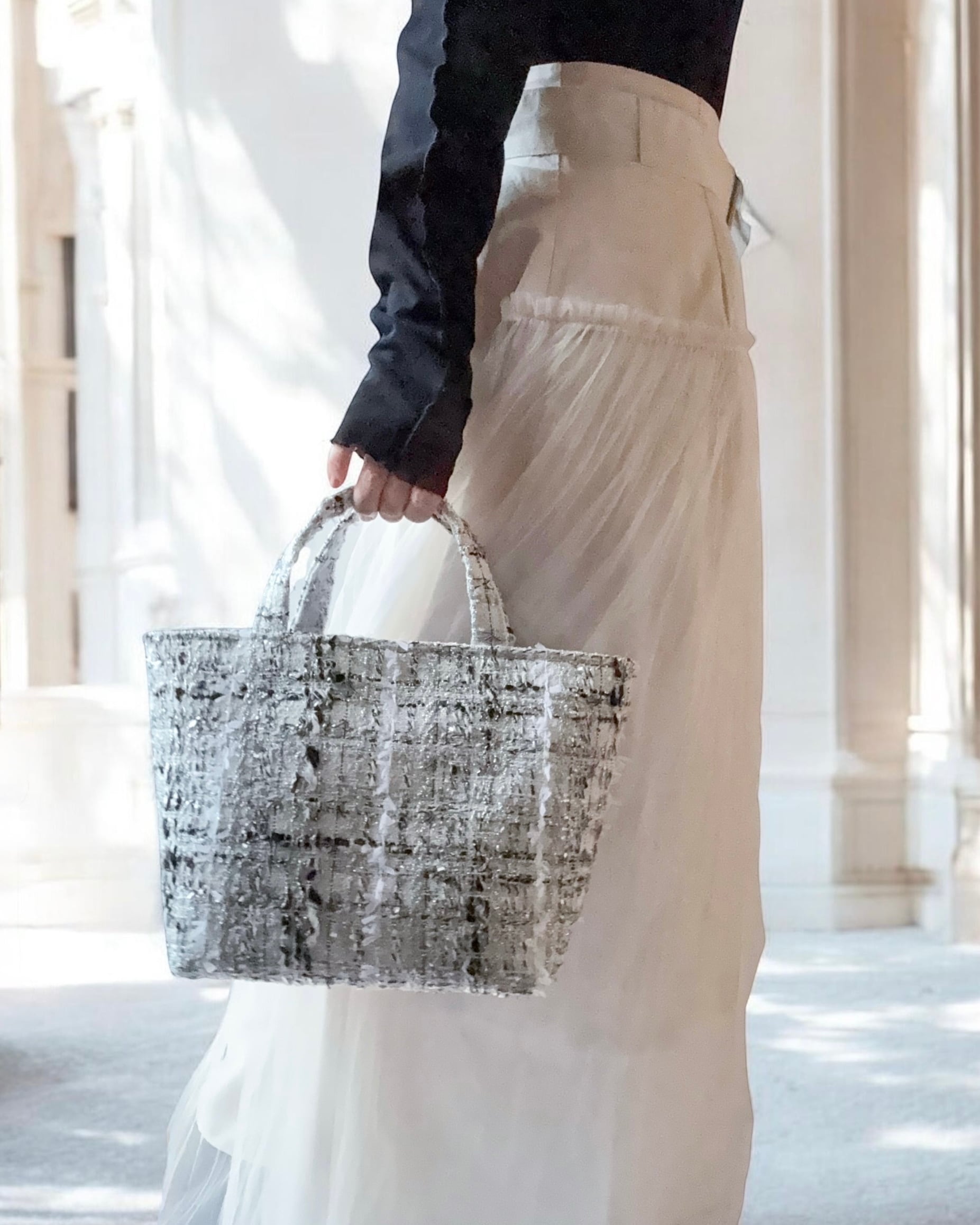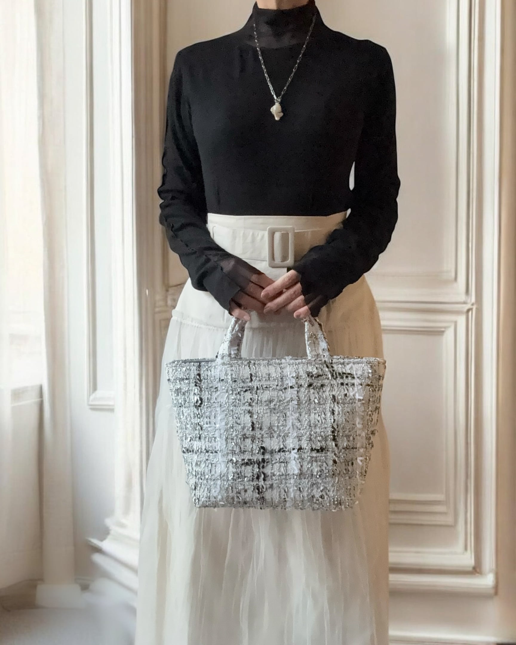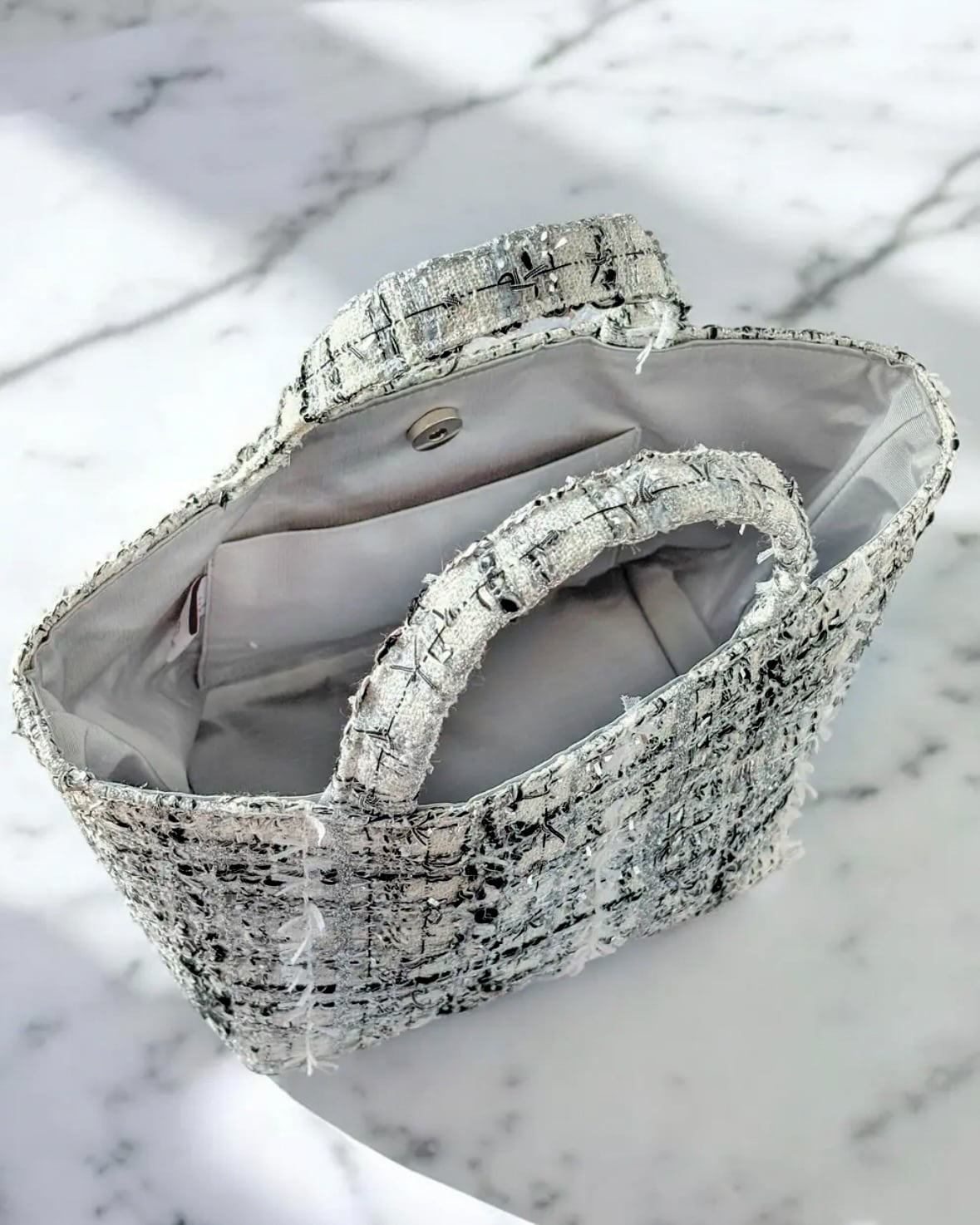 凛としたモノトーンに映える、きらめきが華やかなツイードトートバッグ。