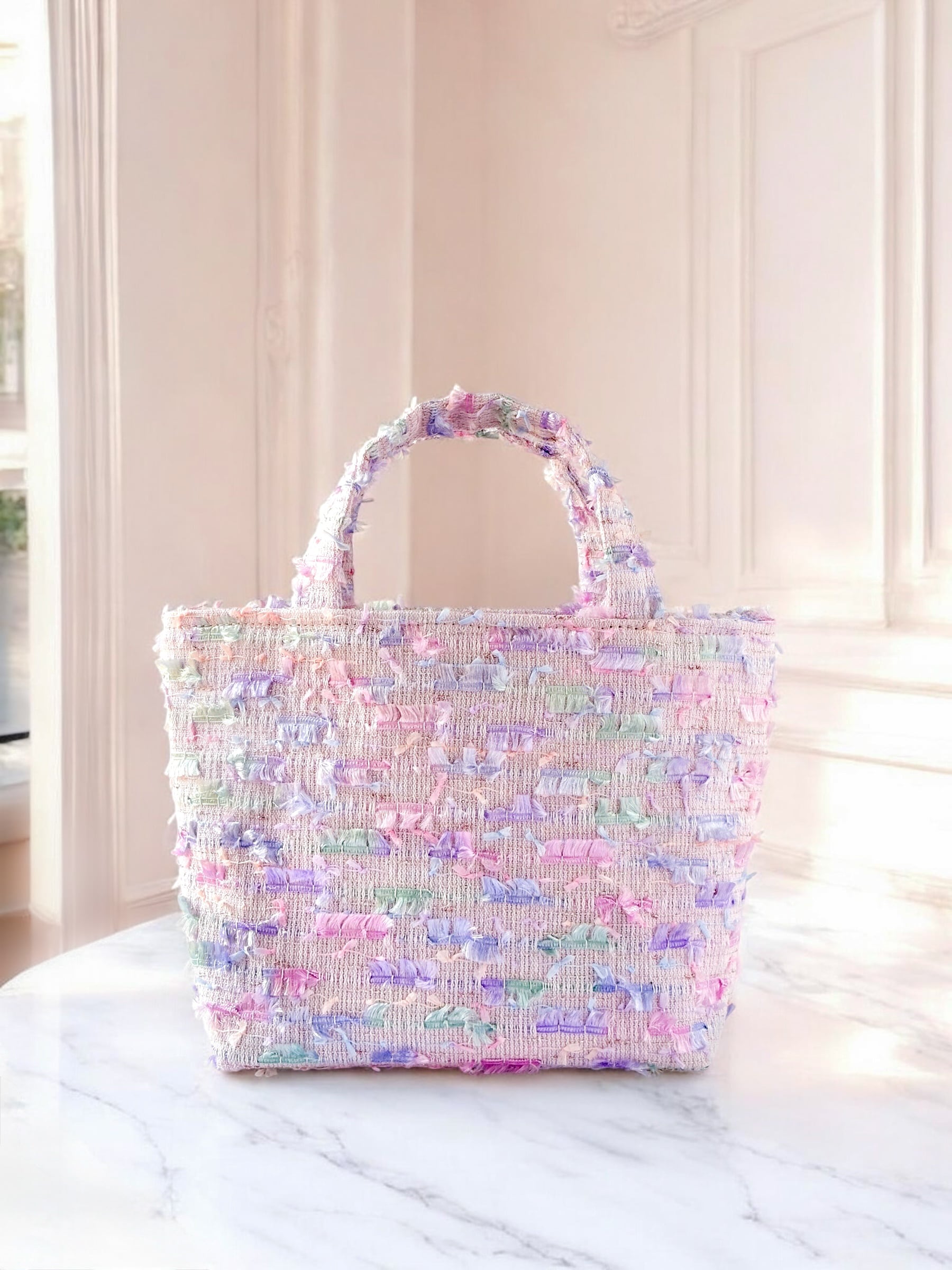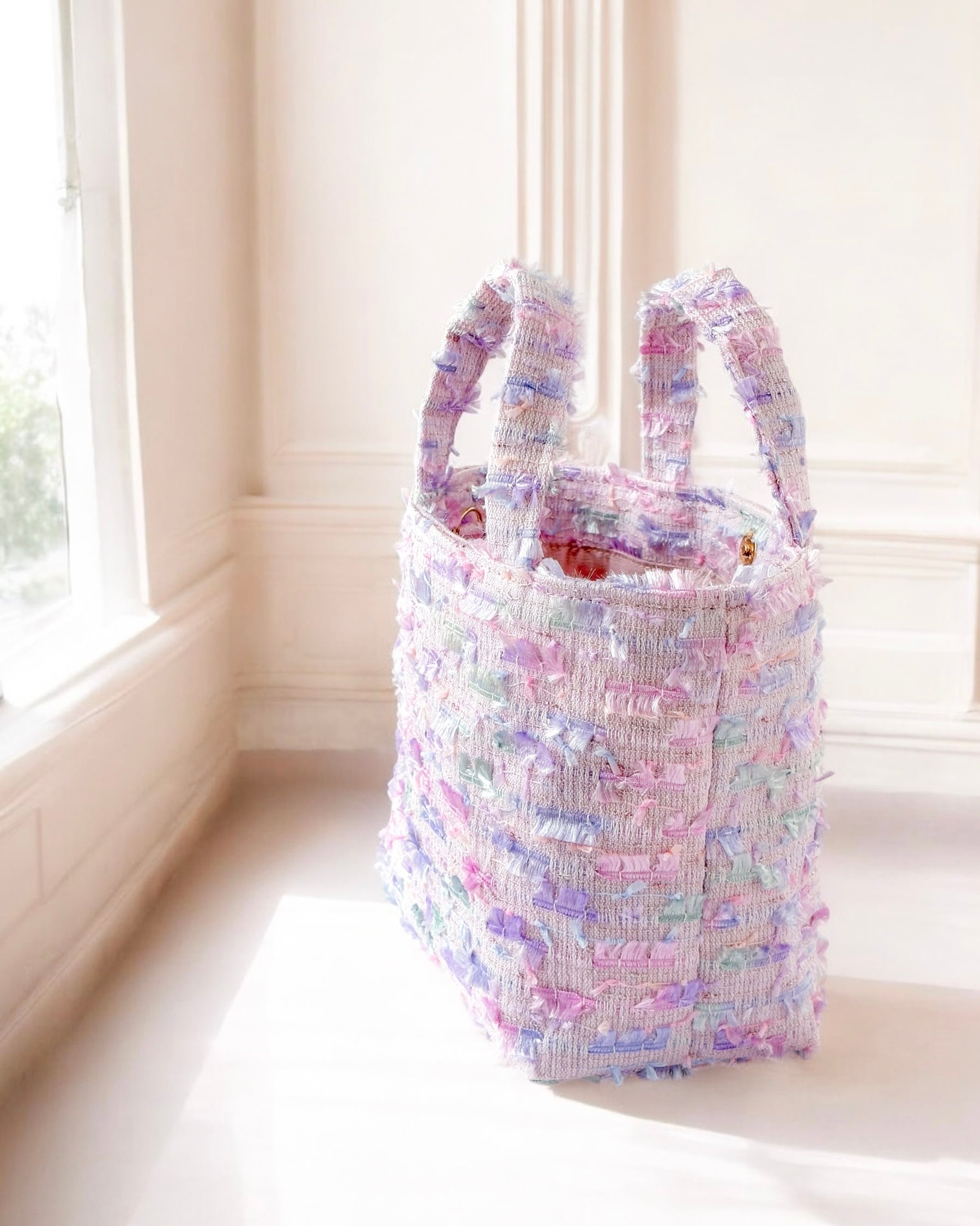 ピンクを基調に、ミントや淡いラベンダーが重なり合うMiros社製ジュエリーツイードを使用したミニトートバッグ。