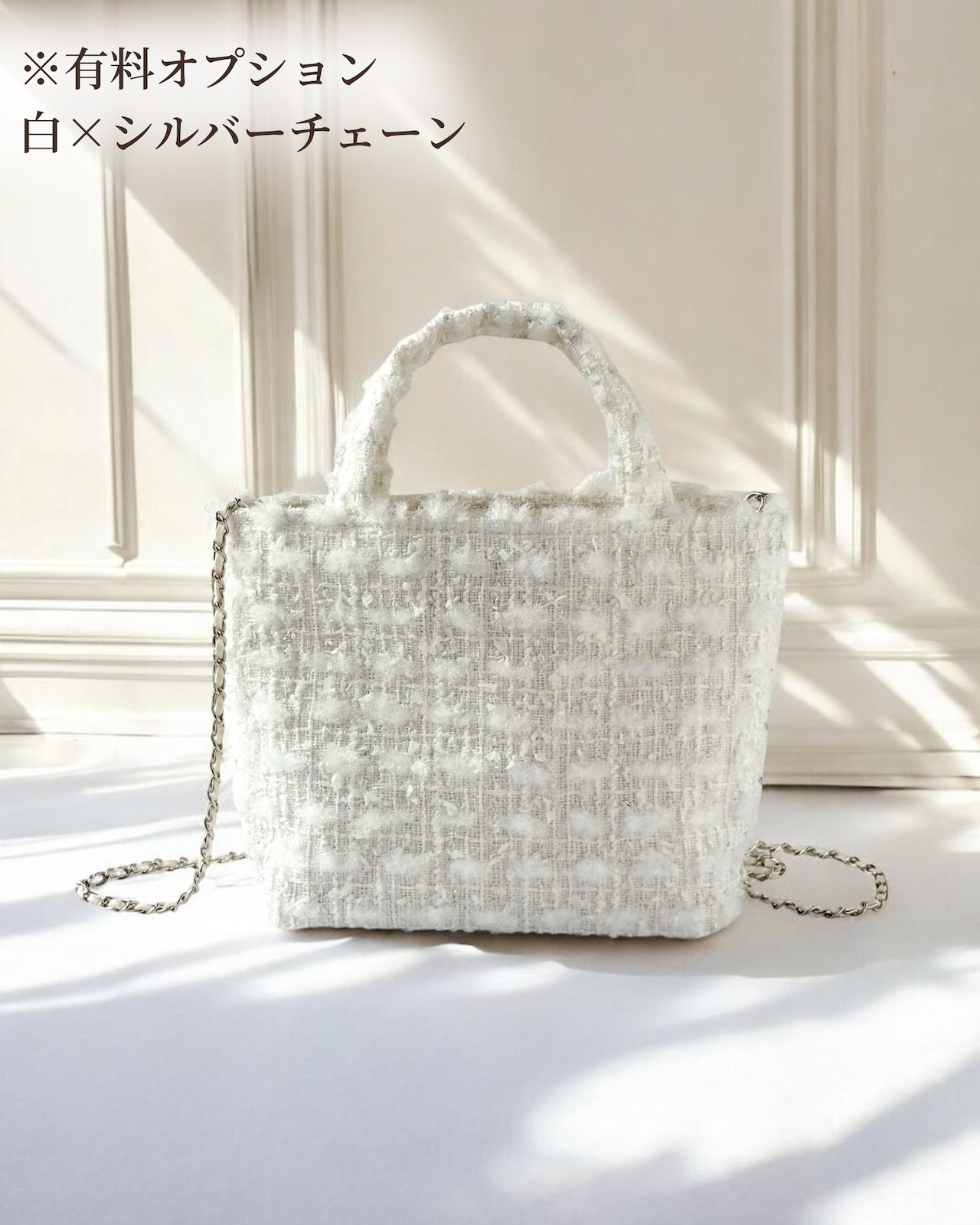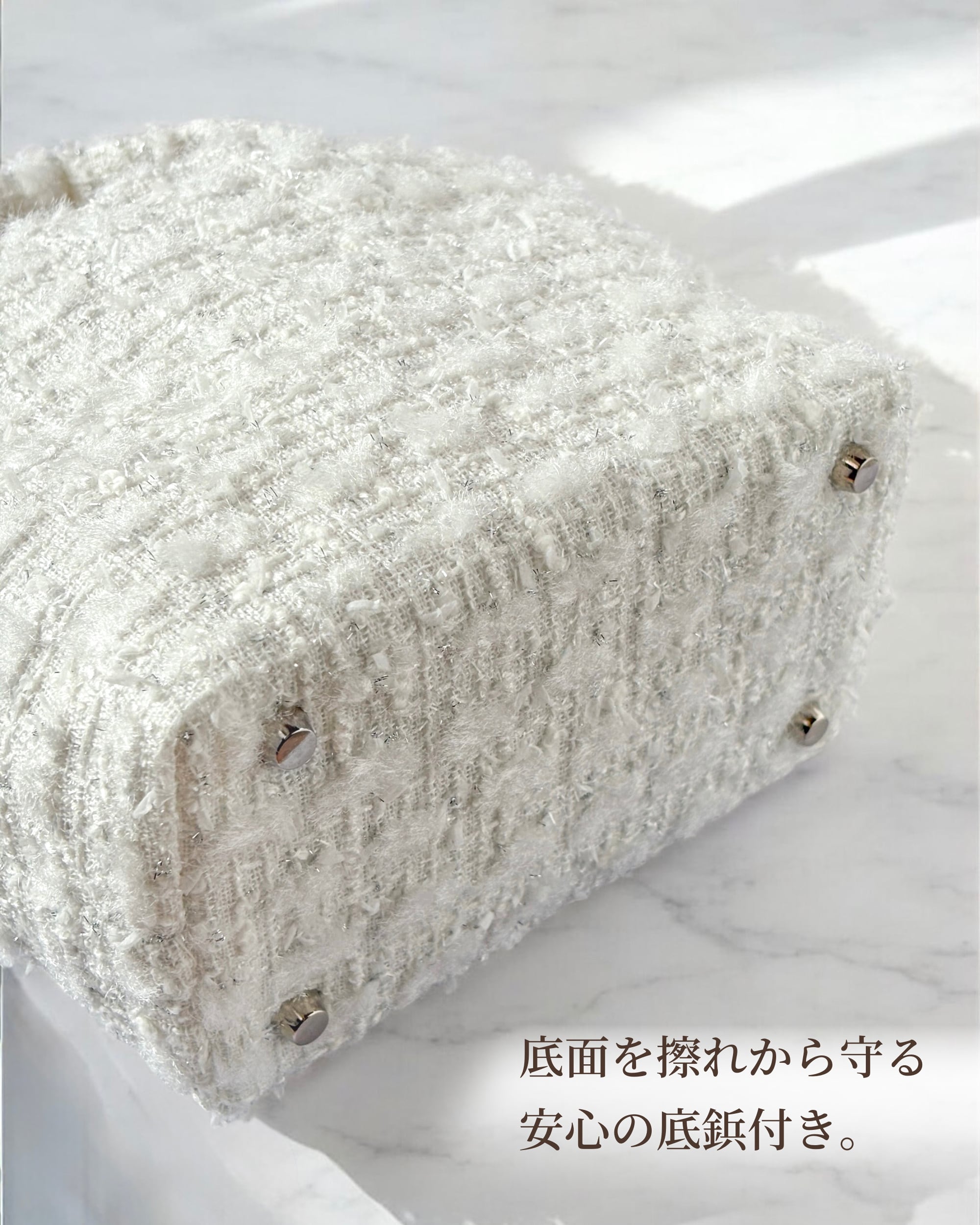 ホワイト ツイード ミニトート ショルダー対応 2way ミロス ジュエリーツイード お出掛け 底鋲・Dカン付き ご褒美