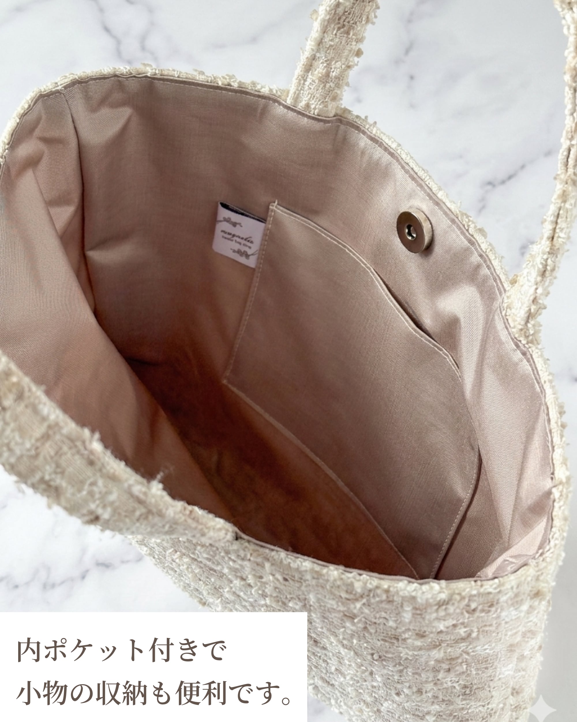 内布には光沢が美しいピンクベージュを合わせ、バッグを開けたときにやさしい華やぎを添える上品な印象に仕立てました。
