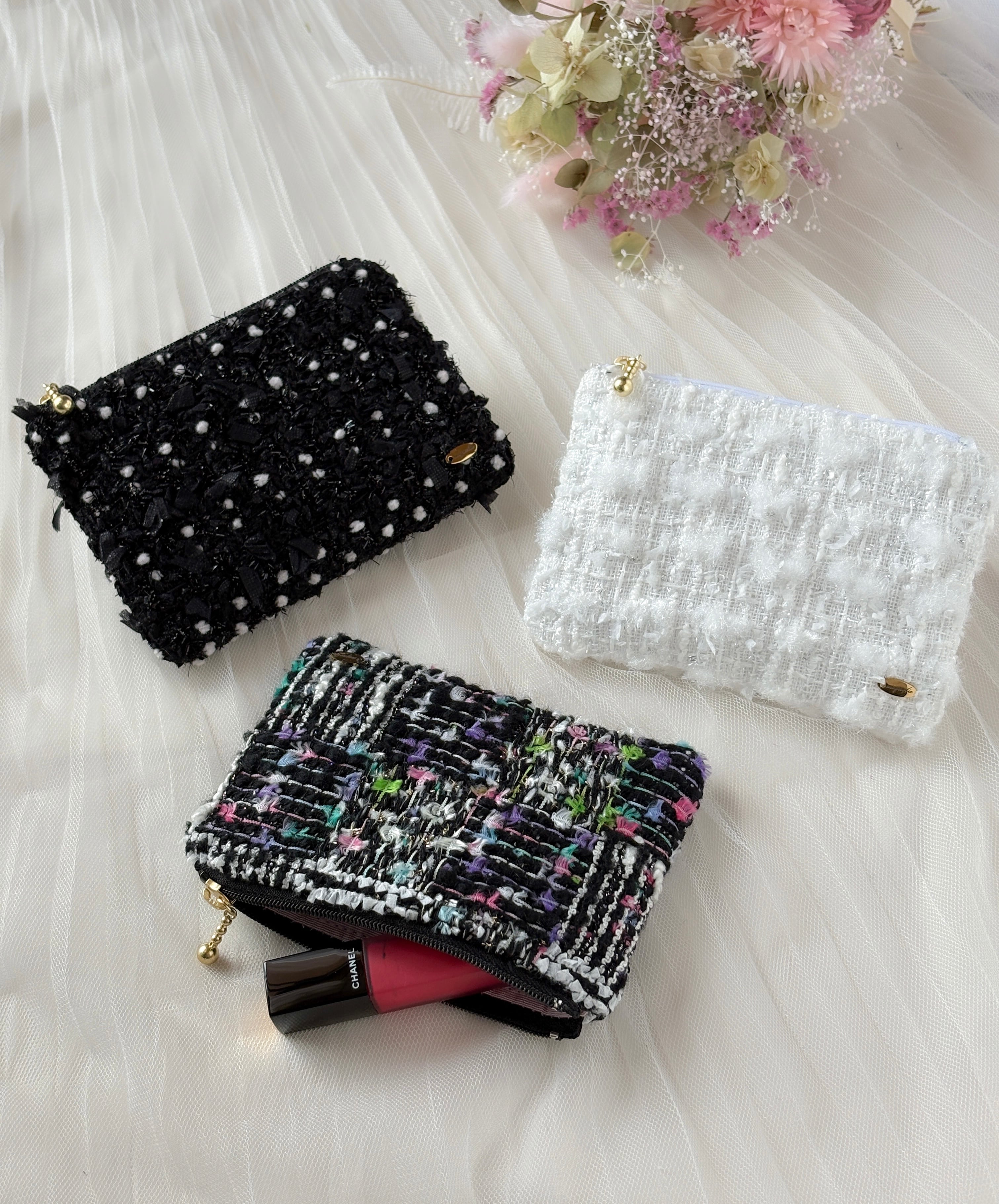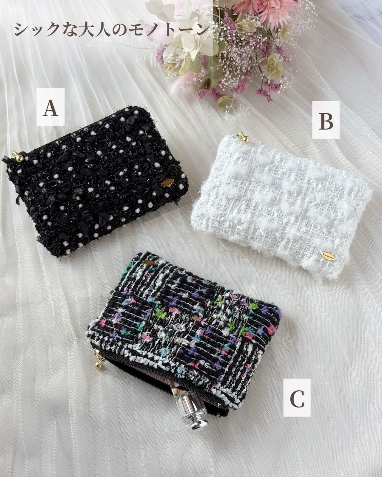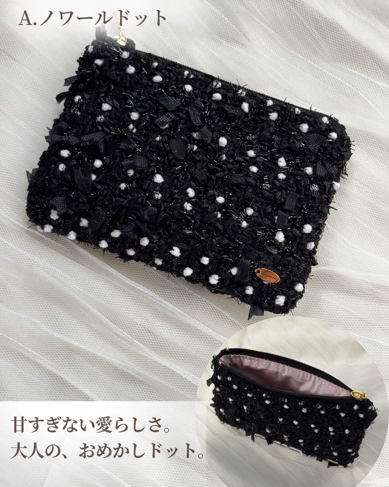 ミニフラットポーチ モノトーン ブラック、ホワイト ドット 化粧ポーチ Miros ツイード プレゼントに♡