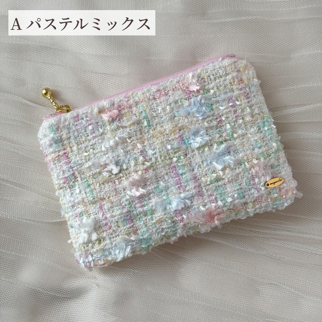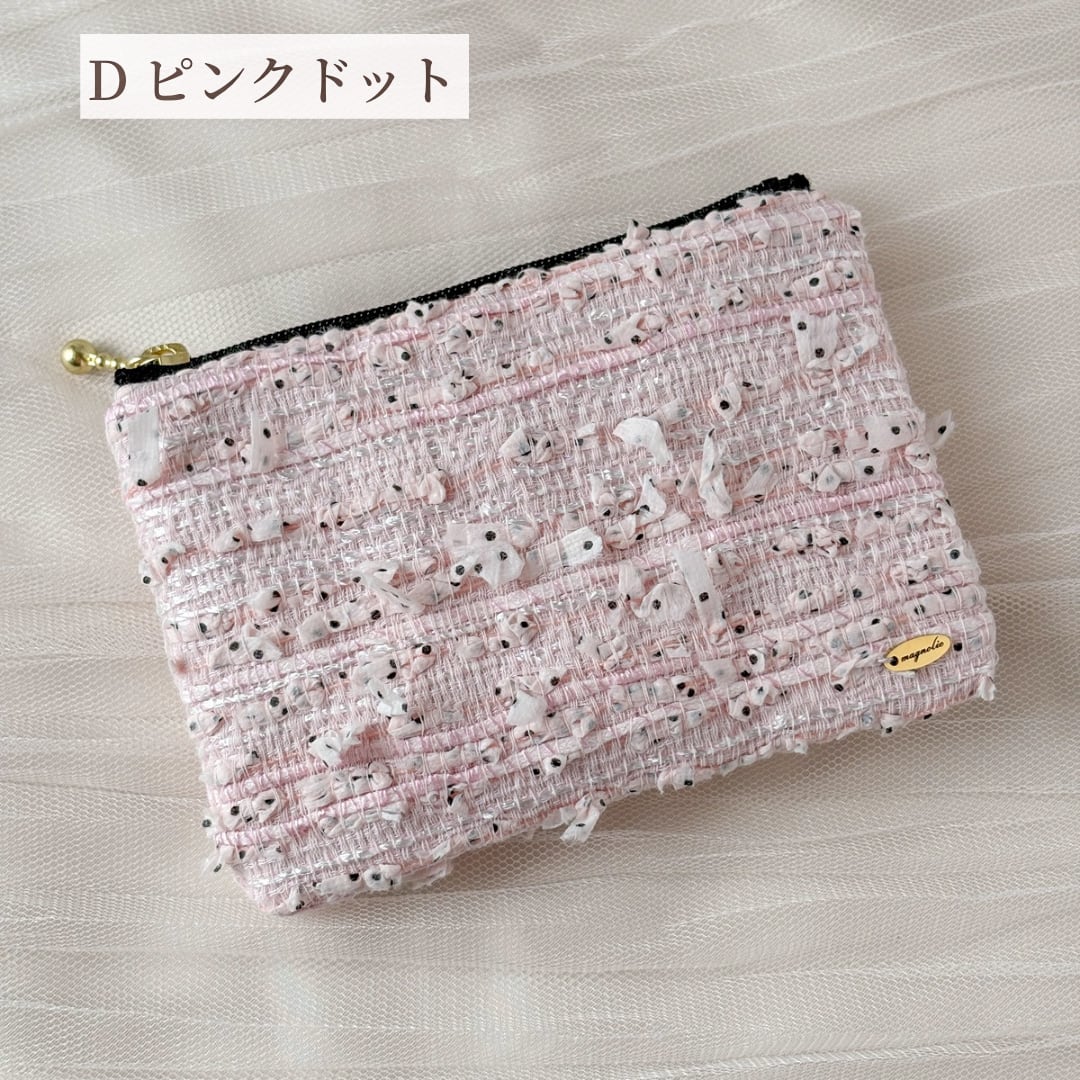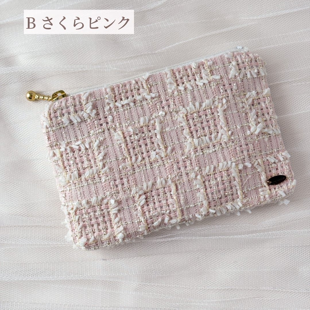 ミニフラットポーチ さくらピンク、ピンク・ドット、アイスブルー、パステルホワイト 化粧ポーチ ツイードポーチ プレゼントに♡