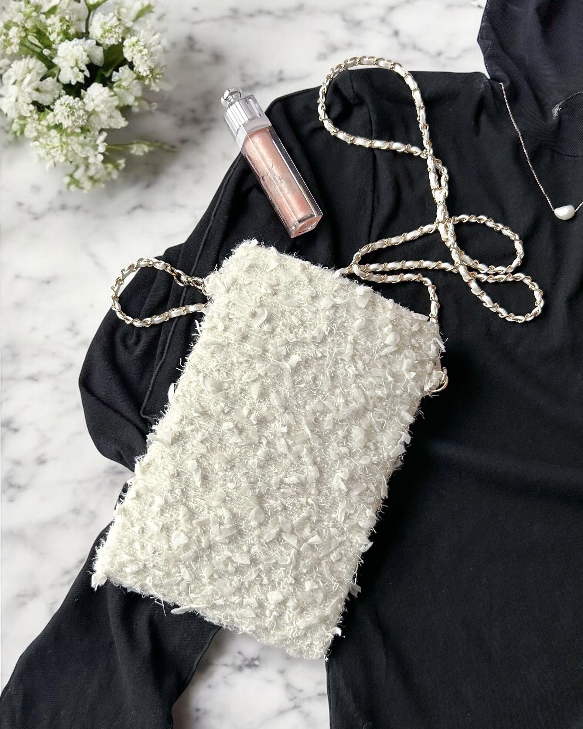 フェザー オフホワイト スマホポシェット ツイード 春のお出掛け セレモニー プレゼント ご褒美♡